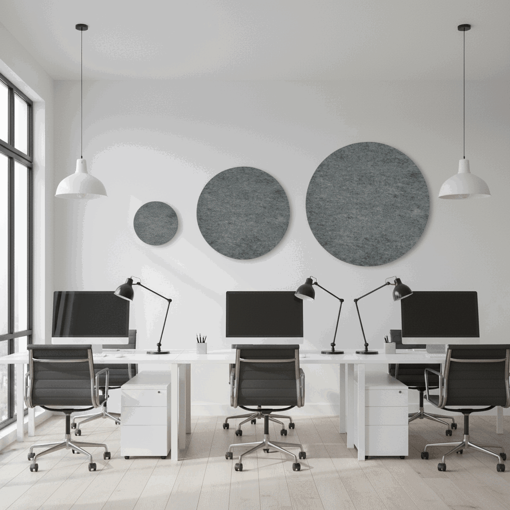 Med sitt runda format blir SilentDirect PES Circle Wall inte bara en akustisk lösning utan även en designdetalj i rummet. Välj enstaka absorbenter som blickfång eller kombinera flera i olika storlekar och färger för att skapa kreativa väggmönster. De tre färgalternativen – vit, grå och svart – gör det enkelt att matcha produkten med både moderna och klassiska interiörer.