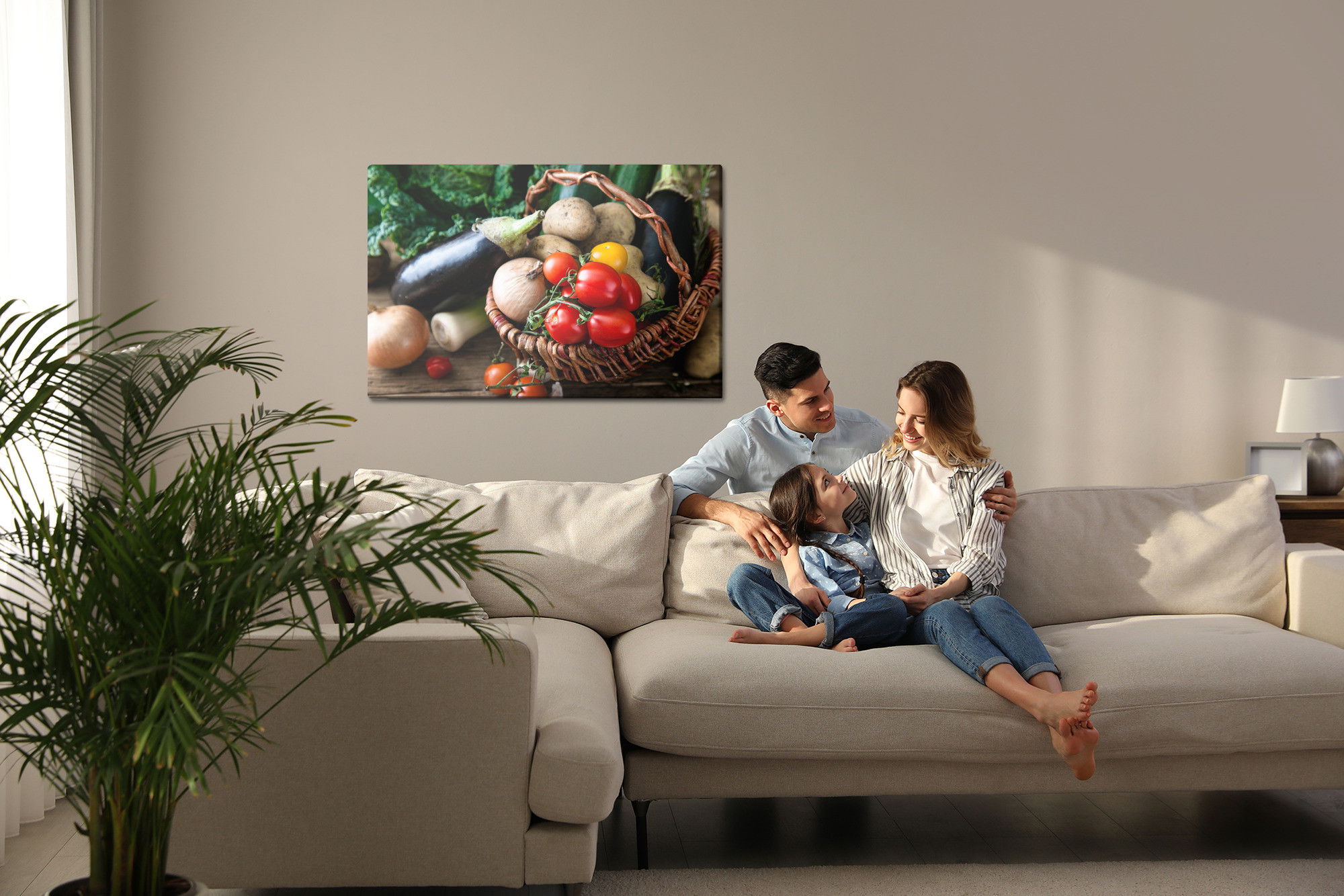 Motivet A basket of vegetables återges med hög färgprecision och detaljrikedom tack vare HP Latex-teknologi. Trycket sker med vattenbaserade, luktfria och GREENGUARD Gold-certifierade bläck som ger en upplösning på upp till 300 DPI. Färgerna är UV-beständiga och behåller sin styrka även i ljusa rum, vilket gör tavlan lämplig för både hem- och offentliga miljöer.