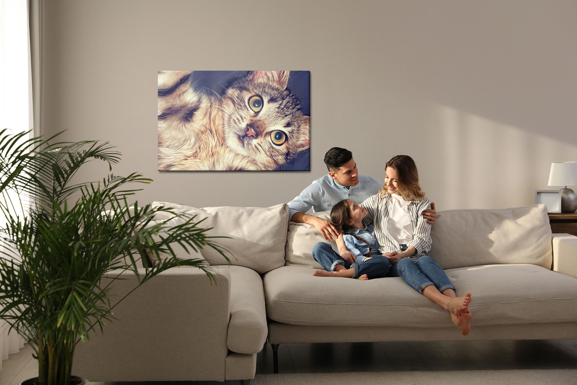 Varje tavla monteras på en massiv fururam. Format upp till 70×50 cm har en ram på 15 mm, medan format från 90×60 cm och uppåt har en ram på 20 mm. Den exakta dukspänningen gör att tavlan håller sin form över tid. Motivet A beautiful feline portrait trycks runt hela ramen vilket ger ett stilrent galleriuttryck där tavlan är lika vacker från sidan som framifrån. Kombinationen av rak dukspänning, rena linjer och korrekt tryck ger en professionell finish.