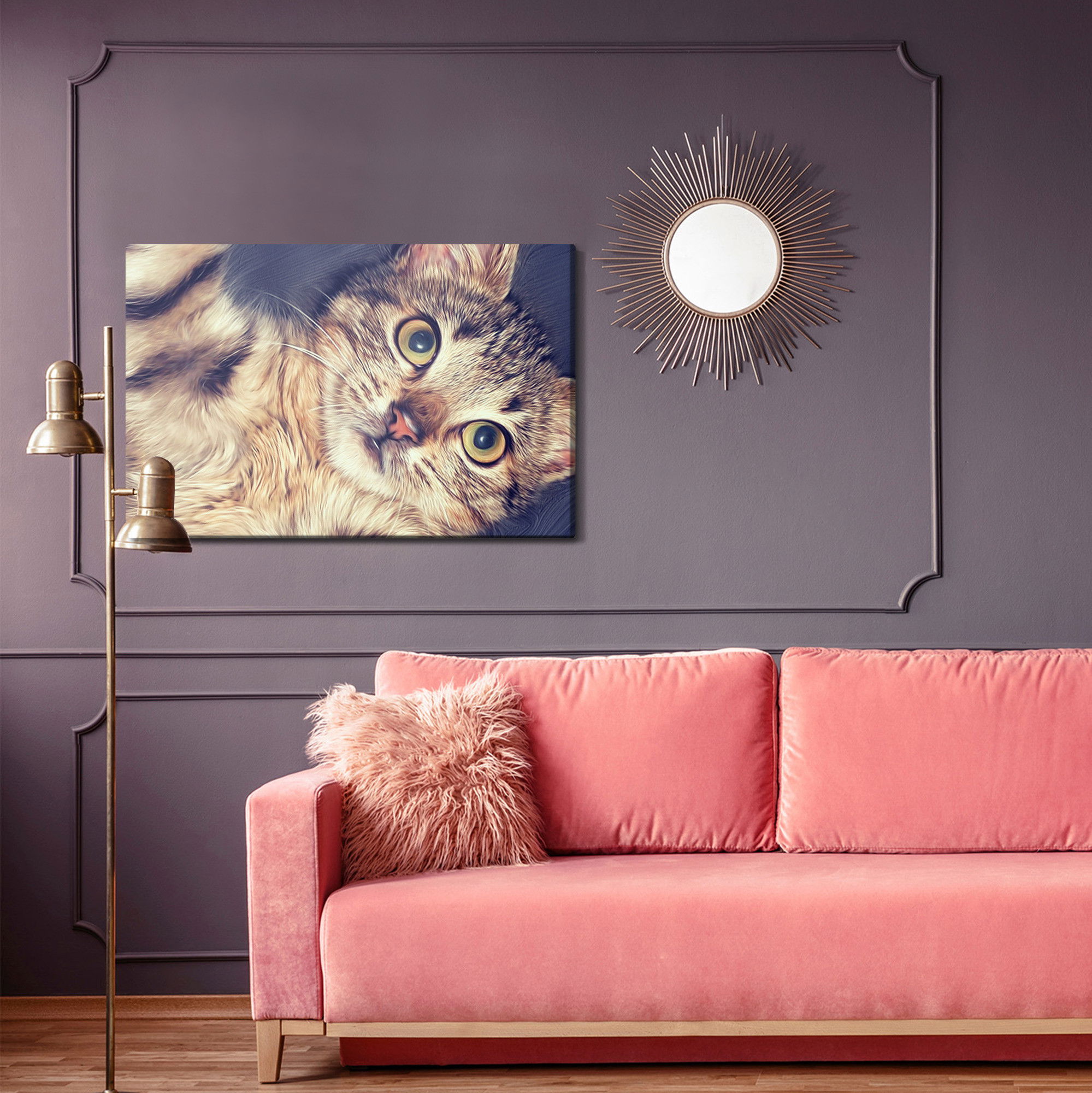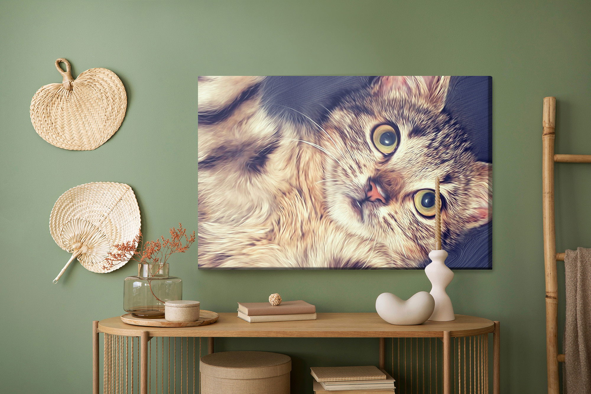 Motivet A beautiful feline portrait återges med hög färgprecision och detaljrikedom tack vare HP Latex-teknologi. Trycket sker med vattenbaserade, luktfria och GREENGUARD Gold-certifierade bläck som ger en upplösning på upp till 300 DPI. Färgerna är UV-beständiga och behåller sin styrka även i ljusa rum, vilket gör tavlan lämplig för både hem- och offentliga miljöer.