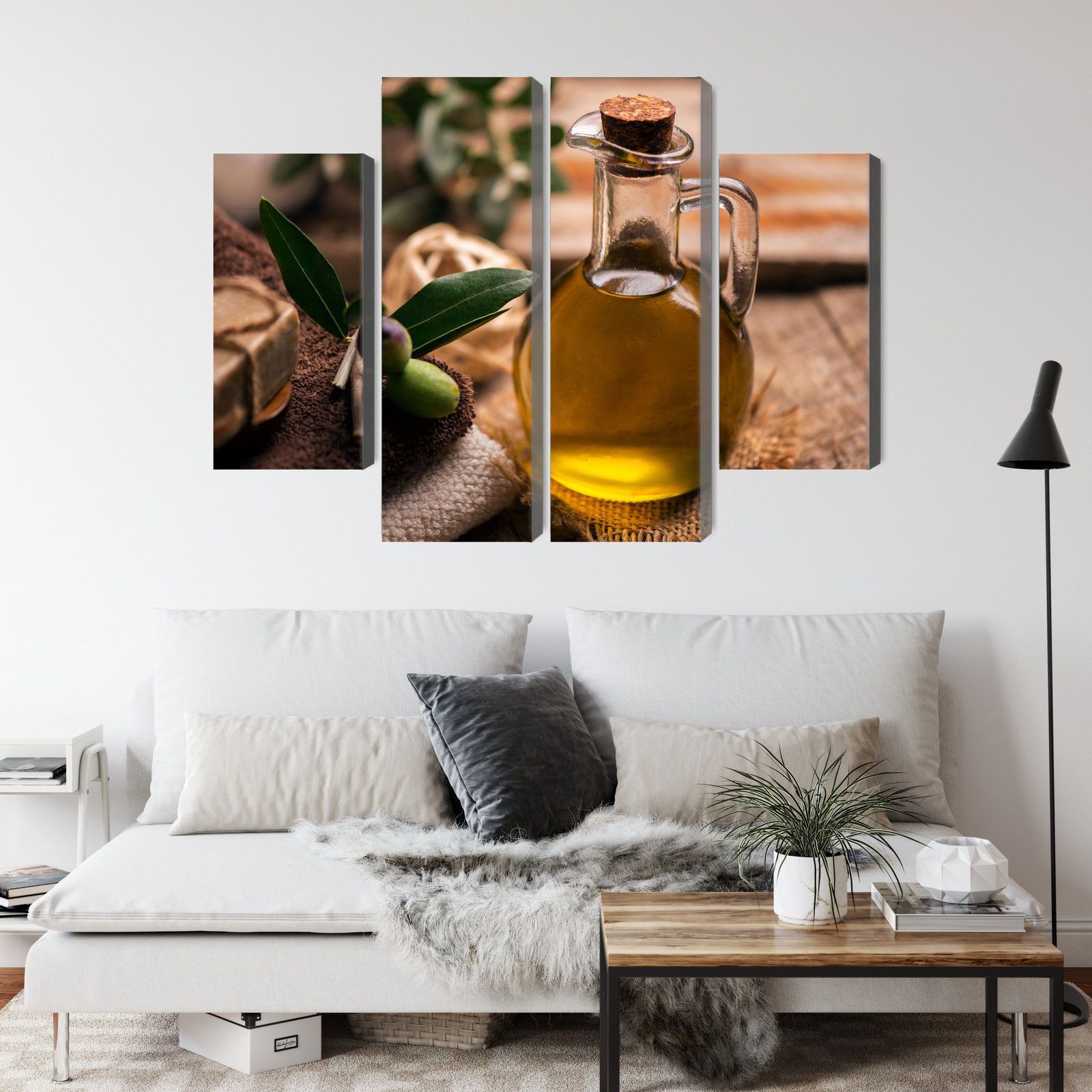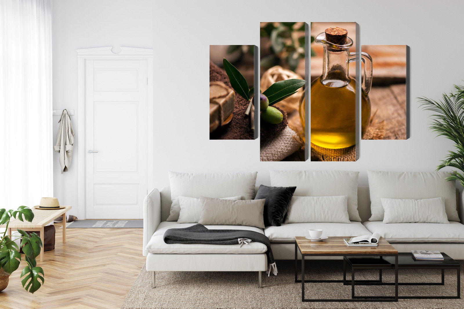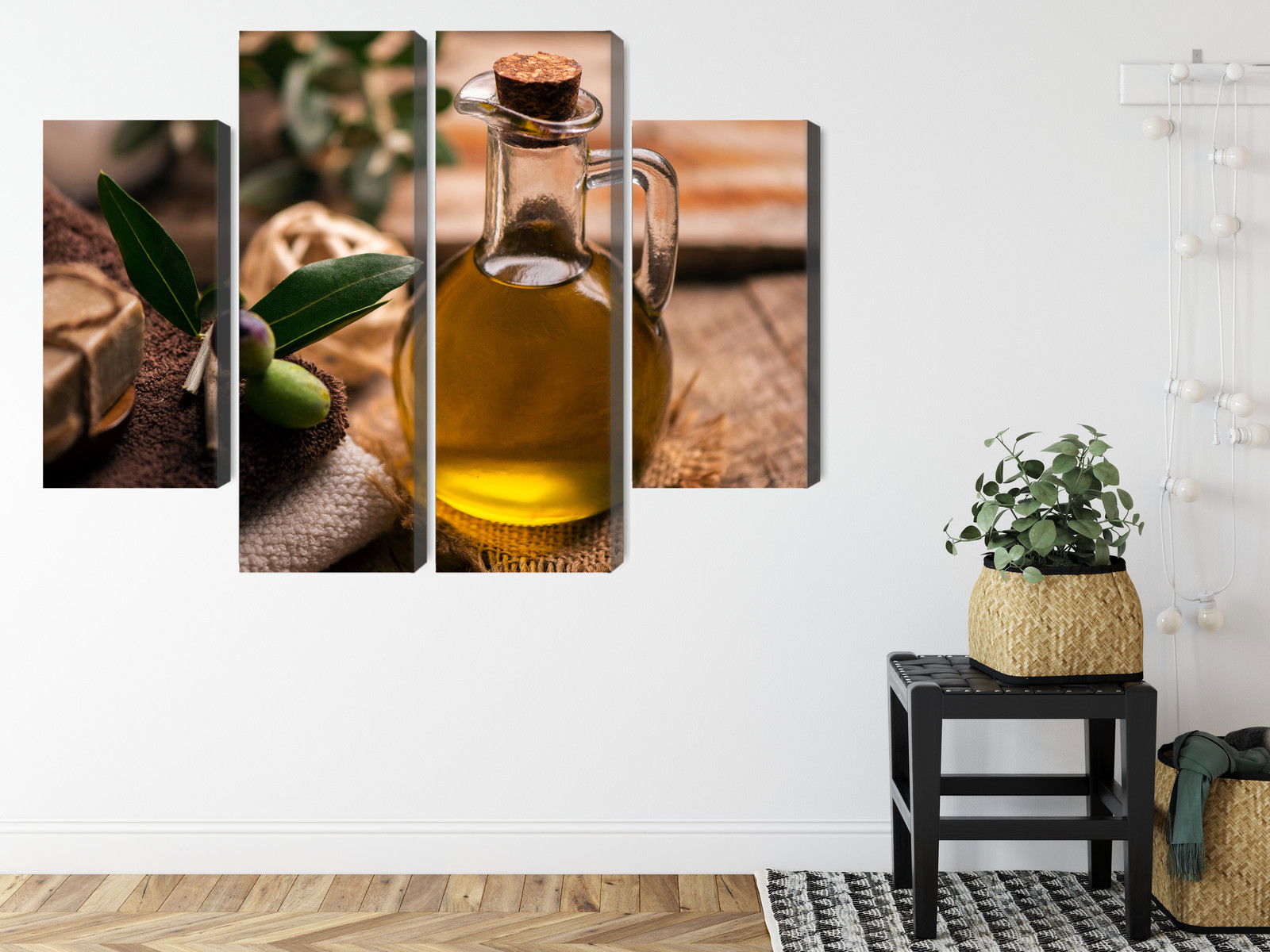 Motivet A bottle of olive oil återges med hög färgprecision och detaljrikedom tack vare HP Latex-teknologi. Trycket sker med vattenbaserade, luktfria och GREENGUARD Gold-certifierade bläck som ger en upplösning på upp till 300 DPI. Färgerna är UV-beständiga och behåller sin styrka även i ljusa rum, vilket gör tavlan lämplig för både hem- och offentliga miljöer.
