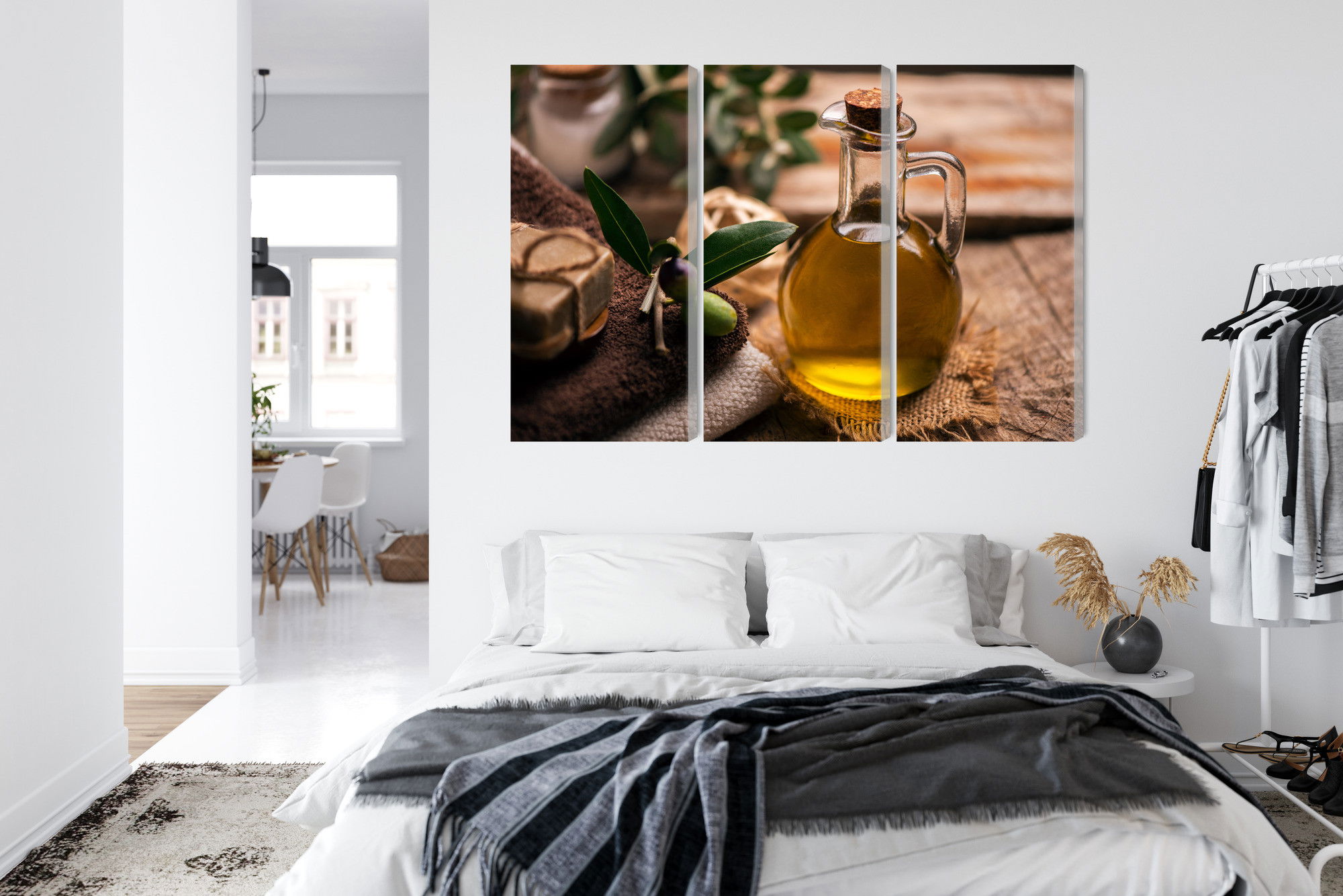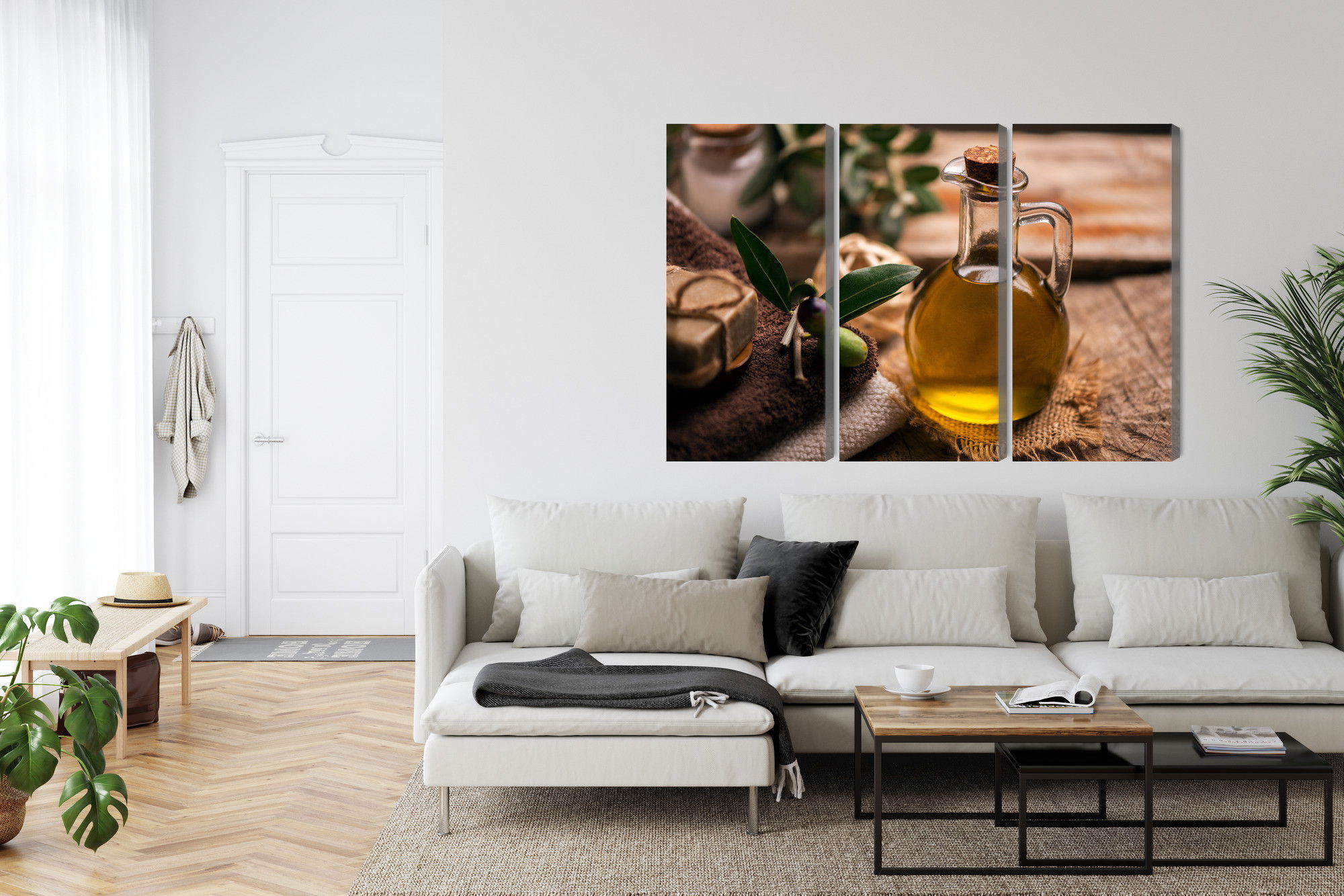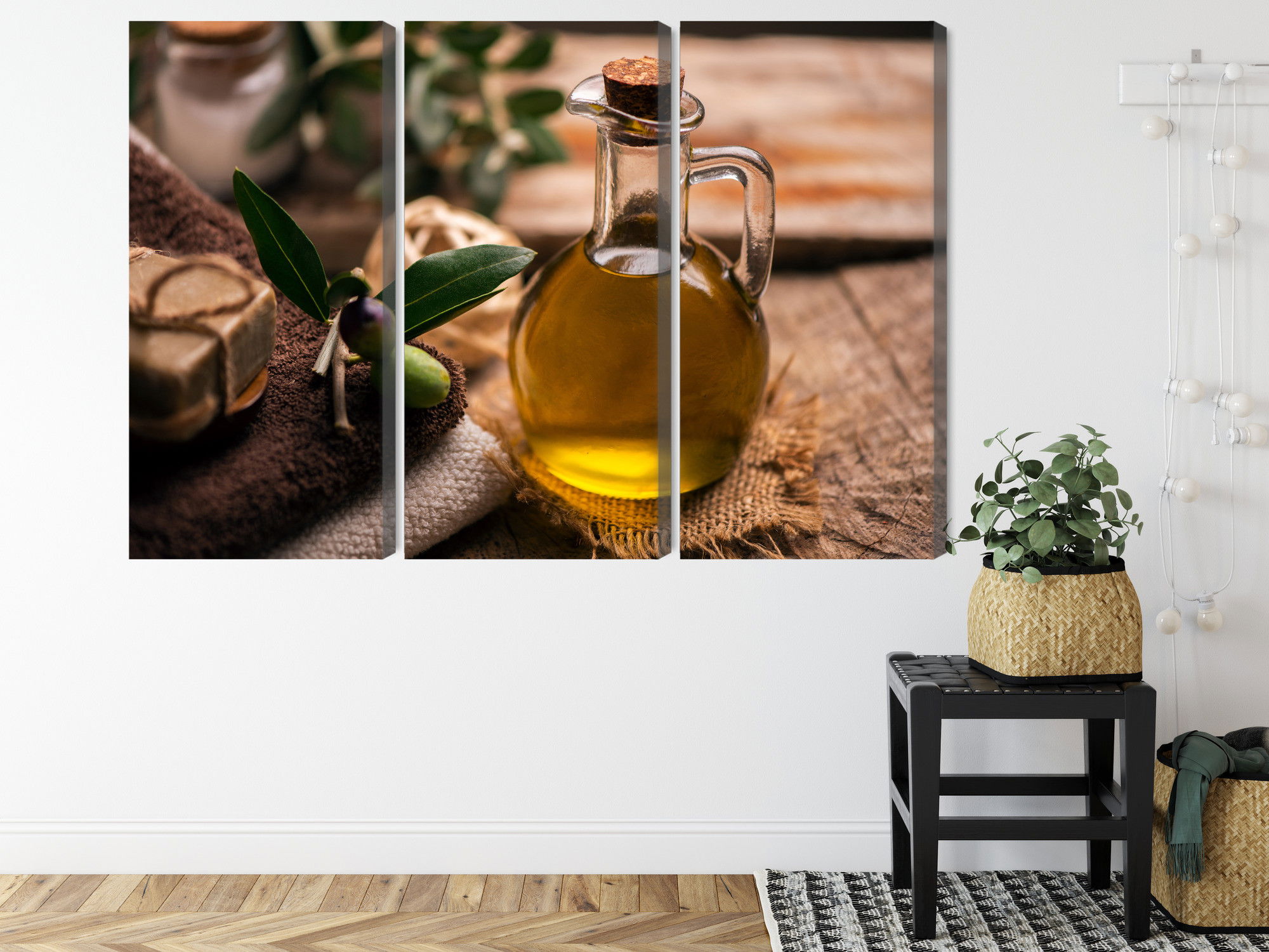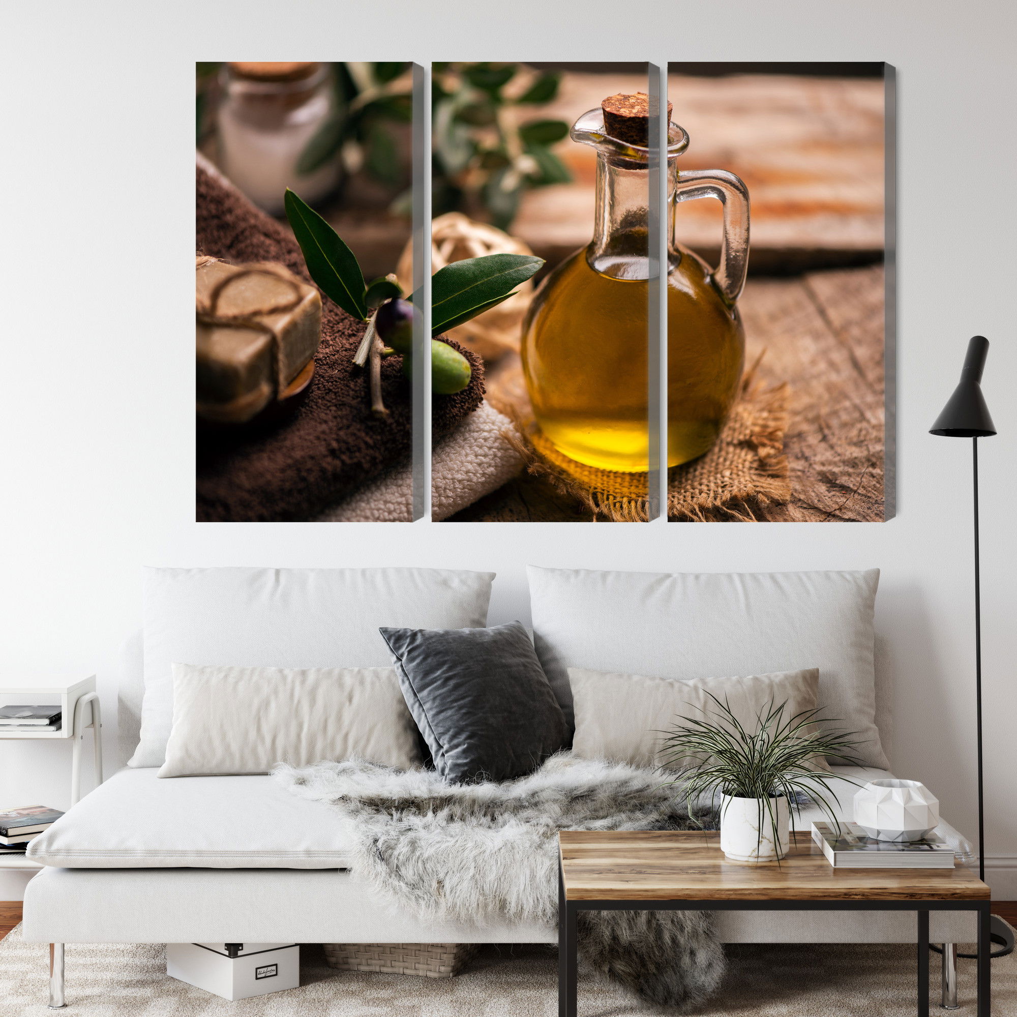 Varje tavla monteras på en massiv fururam. Format upp till 70×50 cm har en ram på 15 mm, medan format från 90×60 cm och uppåt har en ram på 20 mm. Den exakta dukspänningen gör att tavlan håller sin form över tid. Motivet A bottle of olive oil trycks runt hela ramen vilket ger ett stilrent galleriuttryck där tavlan är lika vacker från sidan som framifrån. Kombinationen av rak dukspänning, rena linjer och korrekt tryck ger en professionell finish.
