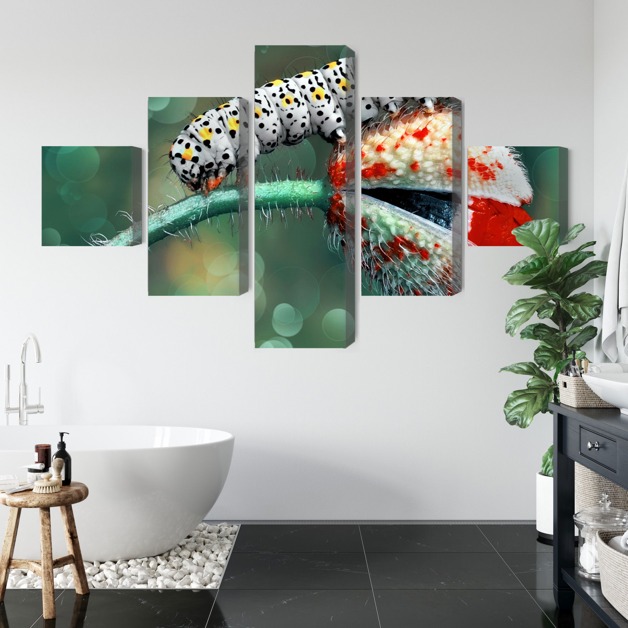 Motivet A caterpillar and a ladybug återges med hög färgprecision och detaljrikedom tack vare HP Latex-teknologi. Trycket sker med vattenbaserade, luktfria och GREENGUARD Gold-certifierade bläck som ger en upplösning på upp till 300 DPI. Färgerna är UV-beständiga och behåller sin styrka även i ljusa rum, vilket gör tavlan lämplig för både hem- och offentliga miljöer.