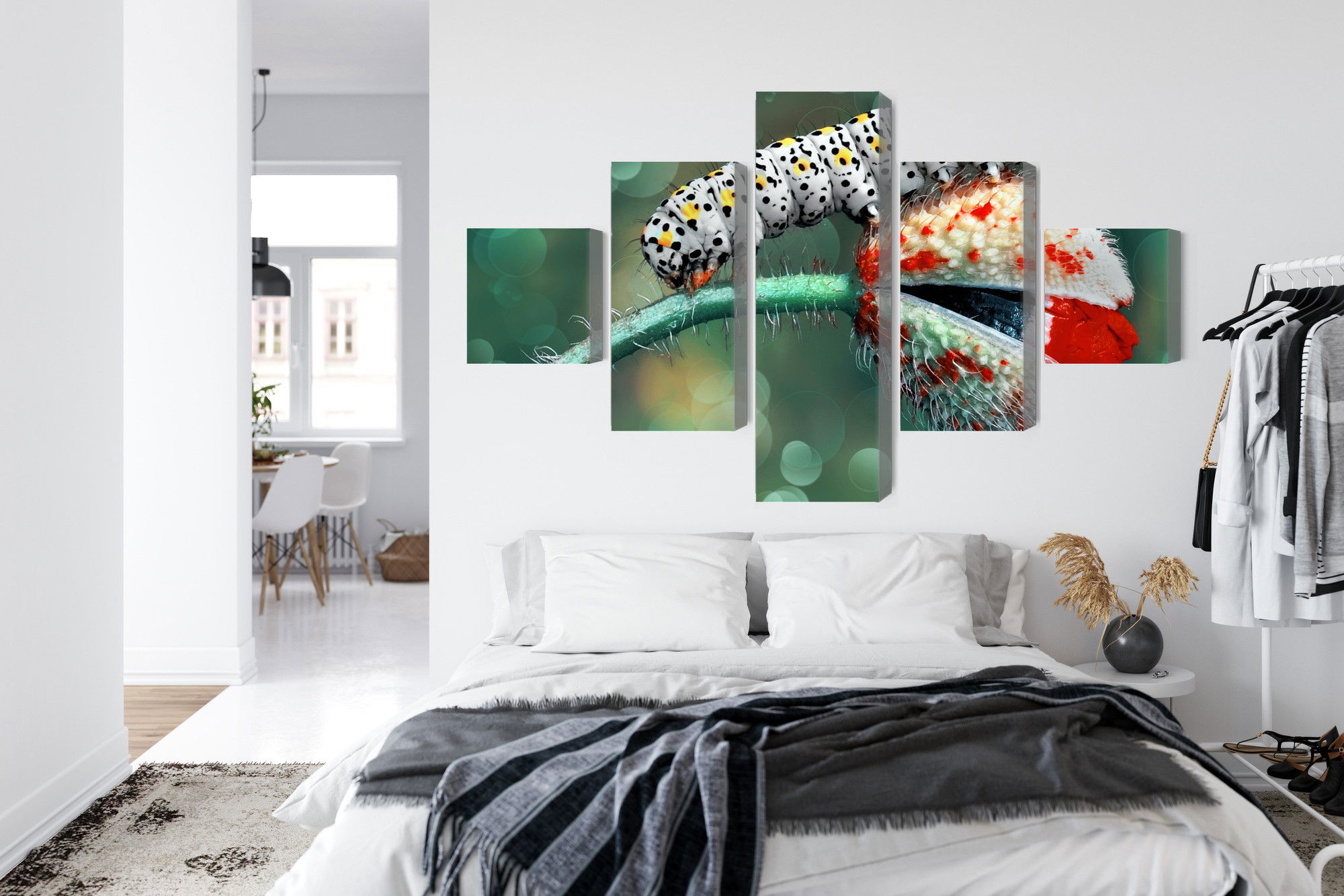 SilentDirects ljuddämpande tavla A caterpillar and a ladybug kombinerar ett högupplöst motiv med avancerad akustikteknik. Varje tavla monteras i Sverige och bygger på en stabil canvastavla med fururam, där insidan av ramen fylls med en ljudabsorberande kärna av återvunnen polyester. Konstruktionen gör tavlan till ett både estetiskt och funktionellt inslag i rummet.