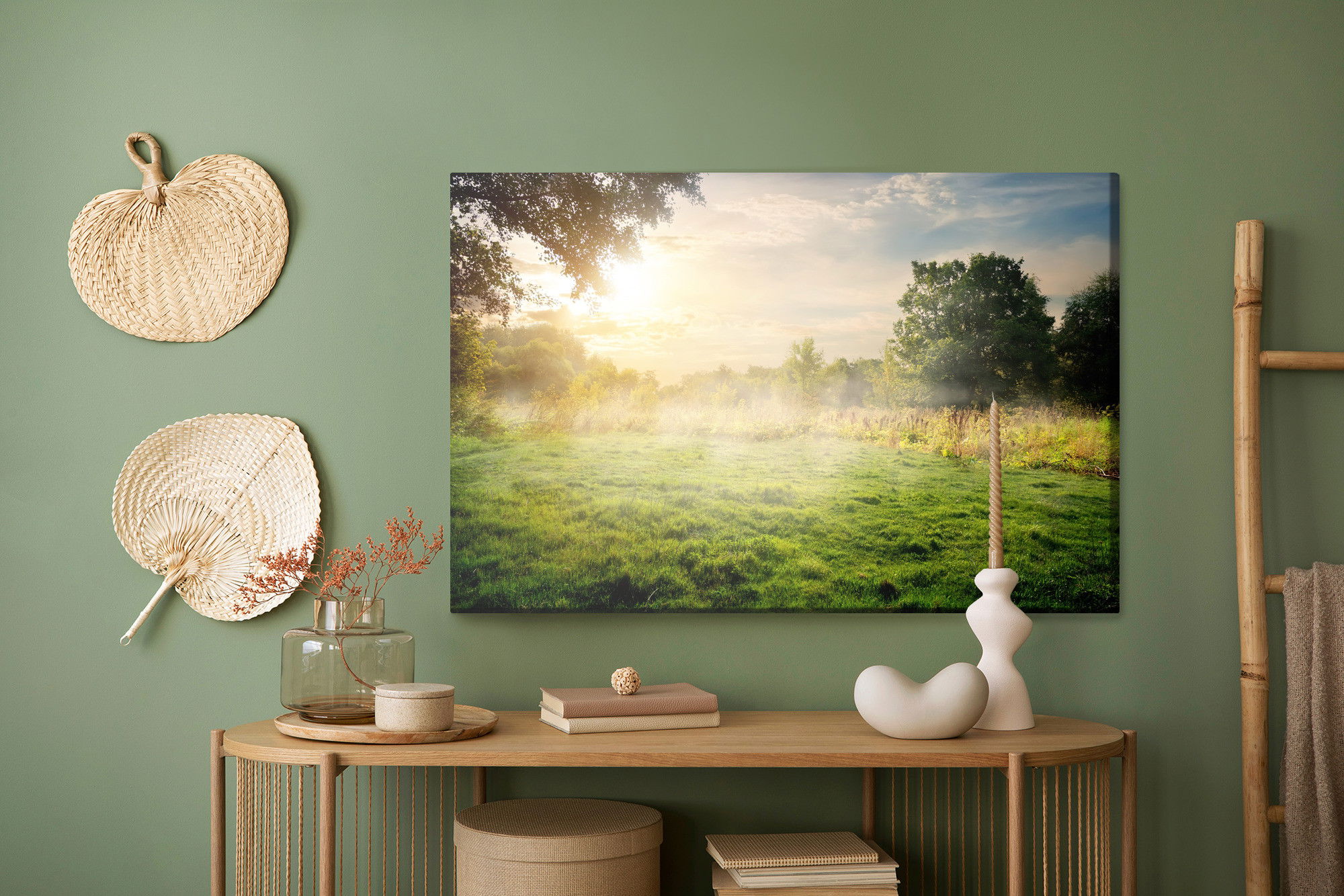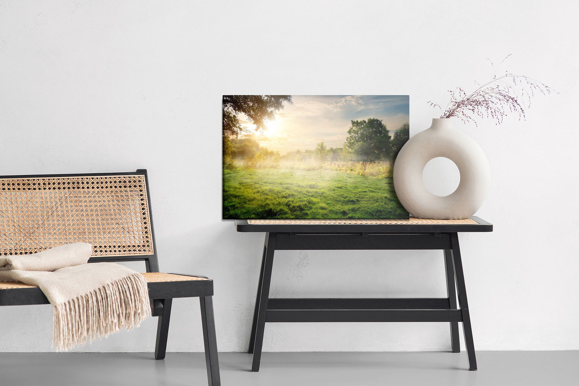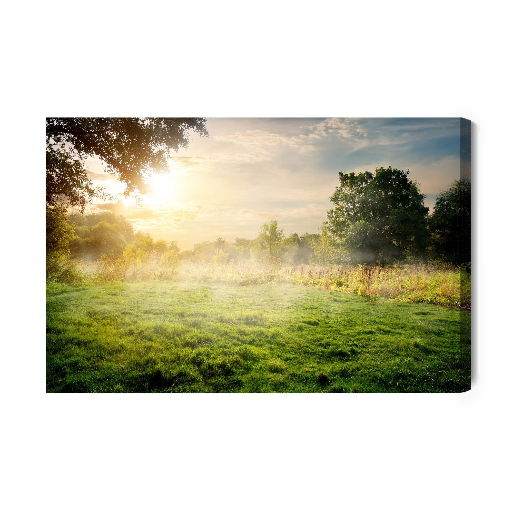 Varje tavla monteras på en massiv fururam. Format upp till 70×50 cm har en ram på 15 mm, medan format från 90×60 cm och uppåt har en ram på 20 mm. Den exakta dukspänningen gör att tavlan håller sin form över tid. Motivet A forest clearing trycks runt hela ramen vilket ger ett stilrent galleriuttryck där tavlan är lika vacker från sidan som framifrån. Kombinationen av rak dukspänning, rena linjer och korrekt tryck ger en professionell finish.
