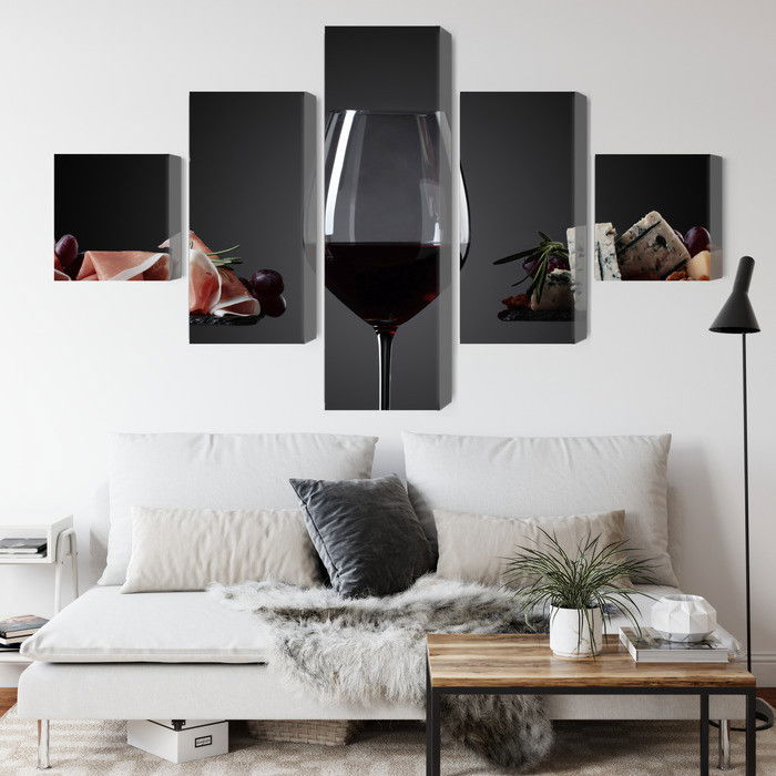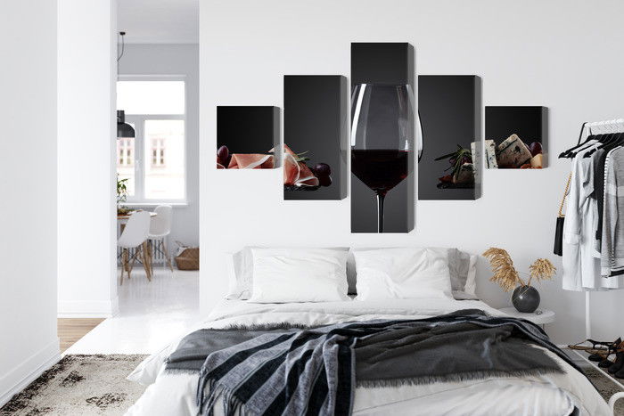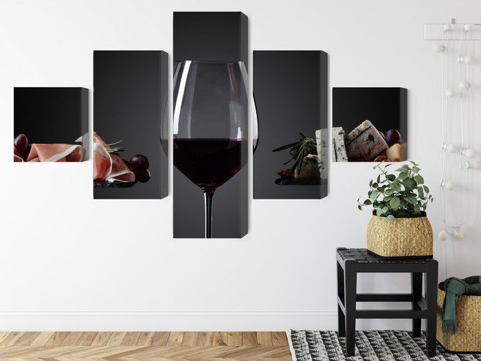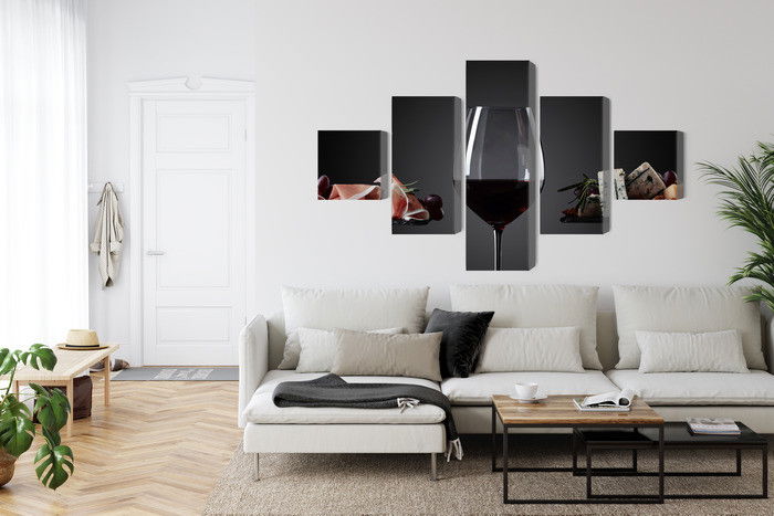 SilentDirects ljuddämpande tavla A glass of red wine kombinerar ett högupplöst motiv med avancerad akustikteknik. Varje tavla monteras i Sverige och bygger på en stabil canvastavla med fururam, där insidan av ramen fylls med en ljudabsorberande kärna av återvunnen polyester. Konstruktionen gör tavlan till ett både estetiskt och funktionellt inslag i rummet.