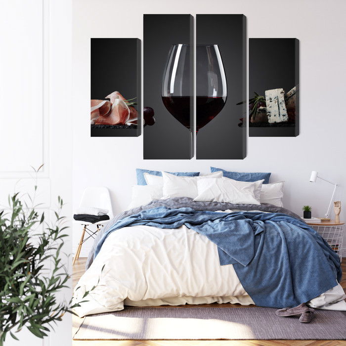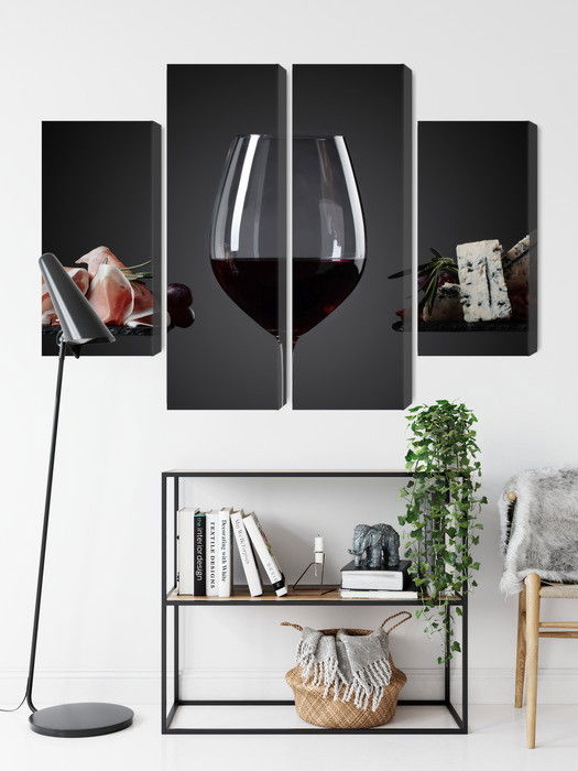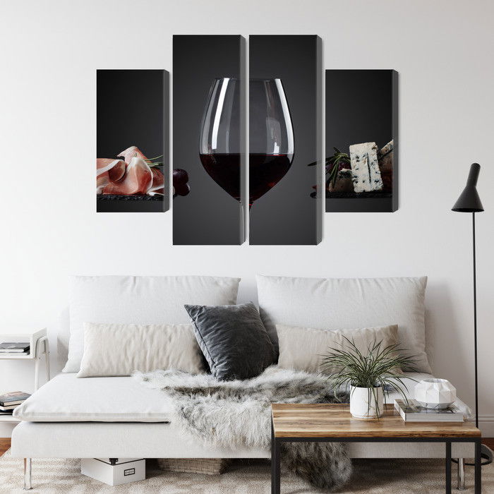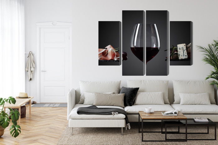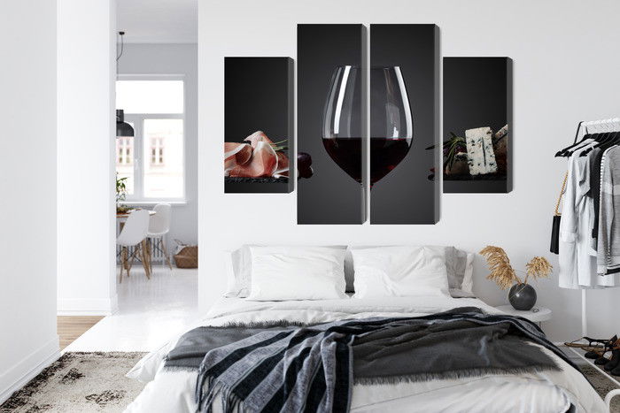 SilentDirects ljuddämpande tavla A glass of red wine kombinerar ett högupplöst motiv med avancerad akustikteknik. Varje tavla monteras i Sverige och bygger på en stabil canvastavla med fururam, där insidan av ramen fylls med en ljudabsorberande kärna av återvunnen polyester. Konstruktionen gör tavlan till ett både estetiskt och funktionellt inslag i rummet.