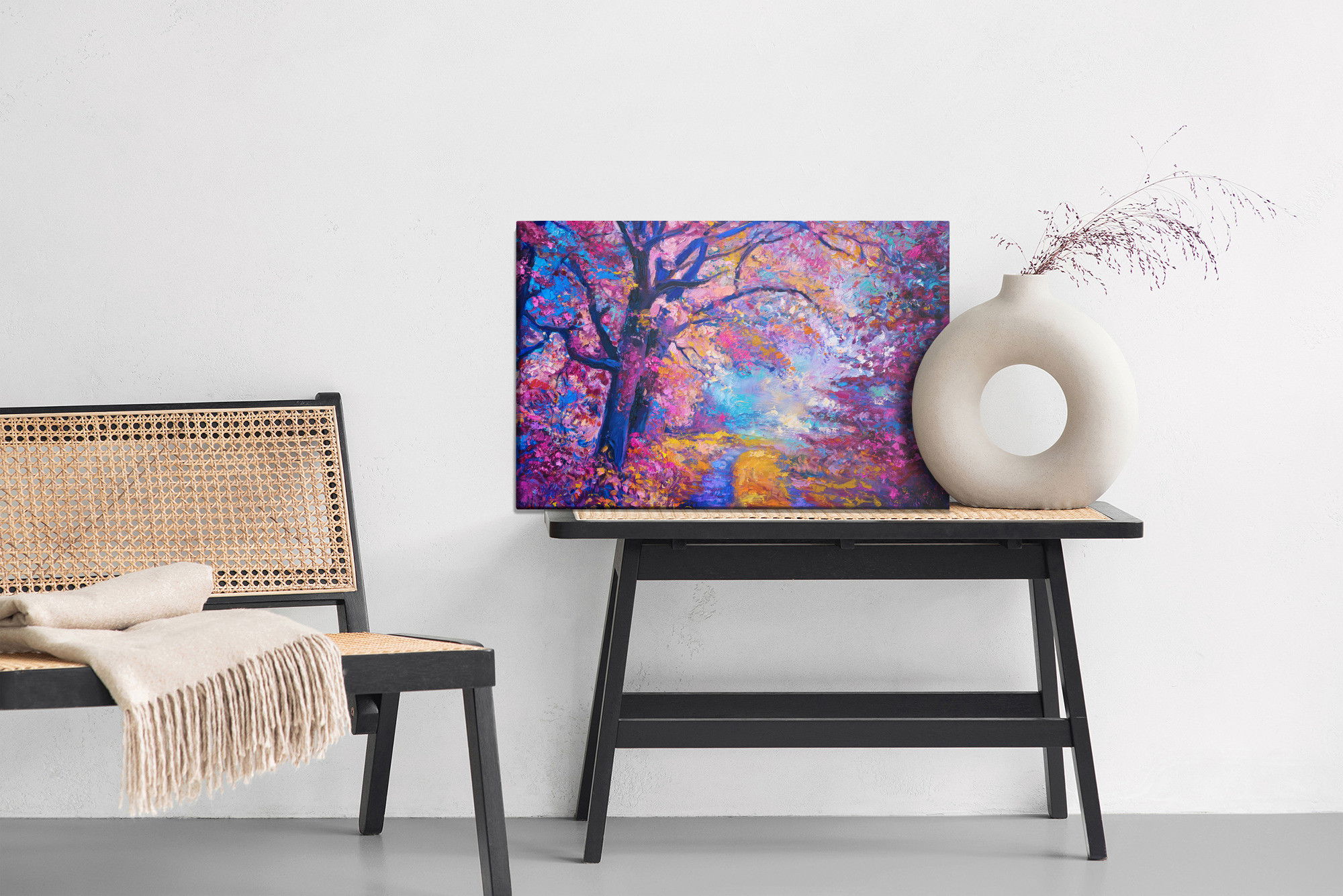 Ljuddämpande tavla – A path in a colorful forest för lugnare rum och mjukare akustik
