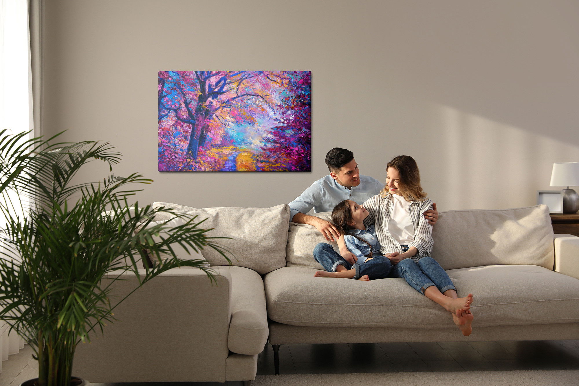 Varje tavla monteras på en massiv fururam. Format upp till 70×50 cm har en ram på 15 mm, medan format från 90×60 cm och uppåt har en ram på 20 mm. Den exakta dukspänningen gör att tavlan håller sin form över tid. Motivet A path in a colorful forest trycks runt hela ramen vilket ger ett stilrent galleriuttryck där tavlan är lika vacker från sidan som framifrån. Kombinationen av rak dukspänning, rena linjer och korrekt tryck ger en professionell finish.