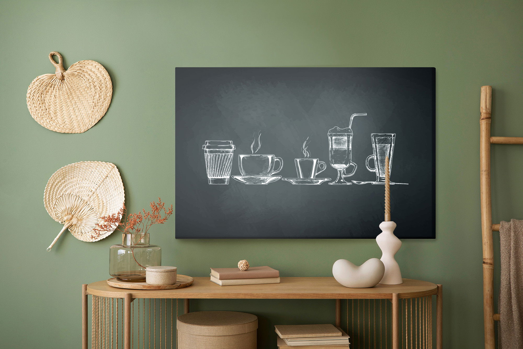 Varje tavla monteras på en massiv fururam. Format upp till 70×50 cm har en ram på 15 mm, medan format från 90×60 cm och uppåt har en ram på 20 mm. Den exakta dukspänningen gör att tavlan håller sin form över tid. Motivet A set of cups trycks runt hela ramen vilket ger ett stilrent galleriuttryck där tavlan är lika vacker från sidan som framifrån. Kombinationen av rak dukspänning, rena linjer och korrekt tryck ger en professionell finish.