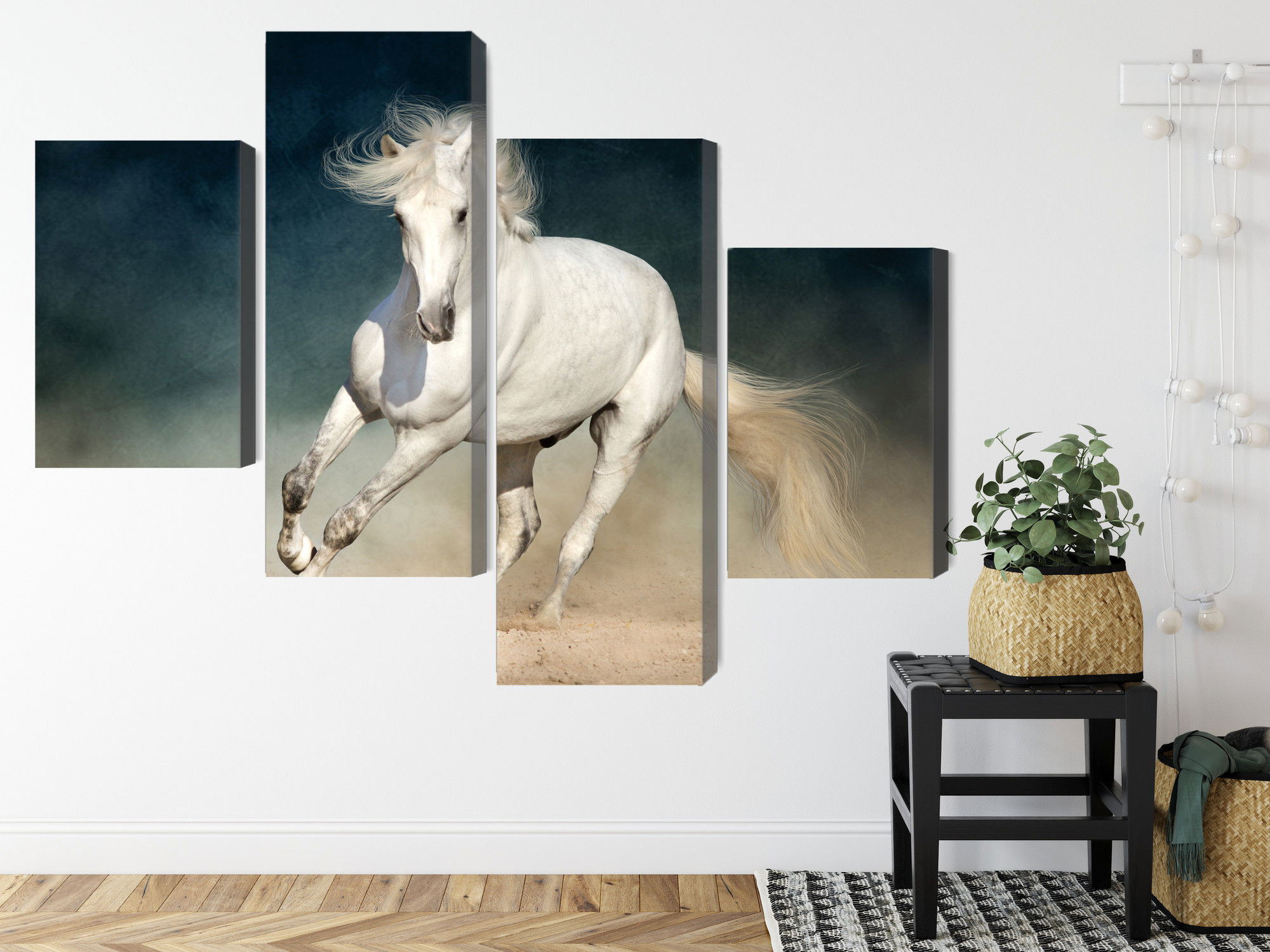 Varje tavla monteras på en massiv fururam. Format upp till 70×50 cm har en ram på 15 mm, medan format från 90×60 cm och uppåt har en ram på 20 mm. Den exakta dukspänningen gör att tavlan håller sin form över tid. Motivet A white horse at a gallop trycks runt hela ramen vilket ger ett stilrent galleriuttryck där tavlan är lika vacker från sidan som framifrån. Kombinationen av rak dukspänning, rena linjer och korrekt tryck ger en professionell finish.