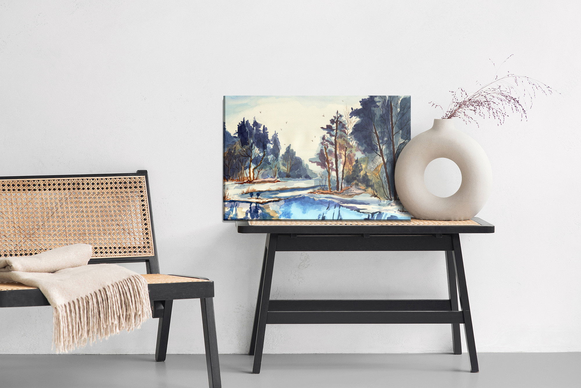 Motivet A winter landscape as if återges med hög färgprecision och detaljrikedom tack vare HP Latex-teknologi. Trycket sker med vattenbaserade, luktfria och GREENGUARD Gold-certifierade bläck som ger en upplösning på upp till 300 DPI. Färgerna är UV-beständiga och behåller sin styrka även i ljusa rum, vilket gör tavlan lämplig för både hem- och offentliga miljöer.