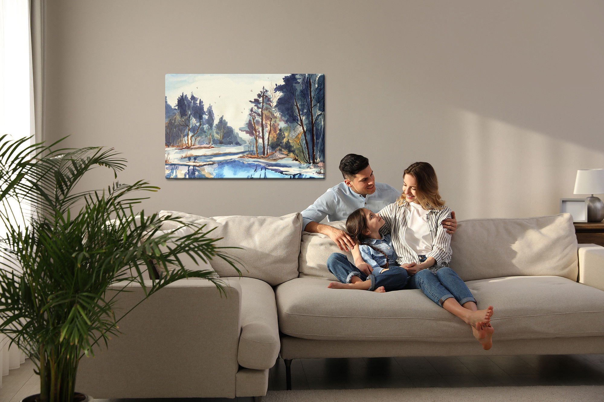 Varje tavla monteras på en massiv fururam. Format upp till 70×50 cm har en ram på 15 mm, medan format från 90×60 cm och uppåt har en ram på 20 mm. Den exakta dukspänningen gör att tavlan håller sin form över tid. Motivet A winter landscape as if trycks runt hela ramen vilket ger ett stilrent galleriuttryck där tavlan är lika vacker från sidan som framifrån. Kombinationen av rak dukspänning, rena linjer och korrekt tryck ger en professionell finish.