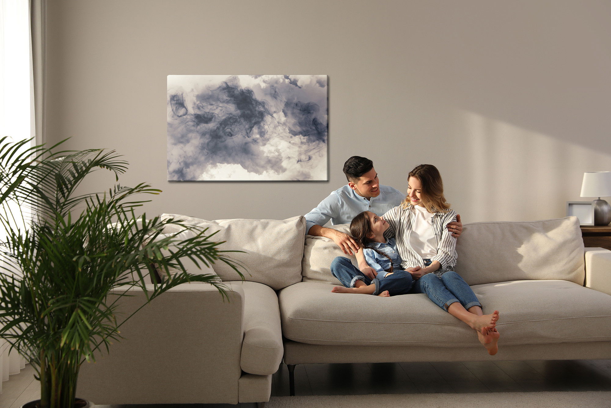 Varje tavla monteras på en massiv fururam. Format upp till 70×50 cm har en ram på 15 mm, medan format från 90×60 cm och uppåt har en ram på 20 mm. Den exakta dukspänningen gör att tavlan håller sin form över tid. Motivet Abstract dark clouds trycks runt hela ramen vilket ger ett stilrent galleriuttryck där tavlan är lika vacker från sidan som framifrån. Kombinationen av rak dukspänning, rena linjer och korrekt tryck ger en professionell finish.