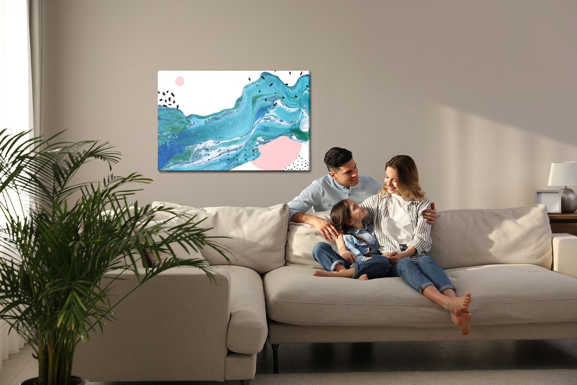 Varje tavla monteras på en massiv fururam. Format upp till 70×50 cm har en ram på 15 mm, medan format från 90×60 cm och uppåt har en ram på 20 mm. Den exakta dukspänningen gör att tavlan håller sin form över tid. Motivet Abstract waves trycks runt hela ramen vilket ger ett stilrent galleriuttryck där tavlan är lika vacker från sidan som framifrån. Kombinationen av rak dukspänning, rena linjer och korrekt tryck ger en professionell finish.