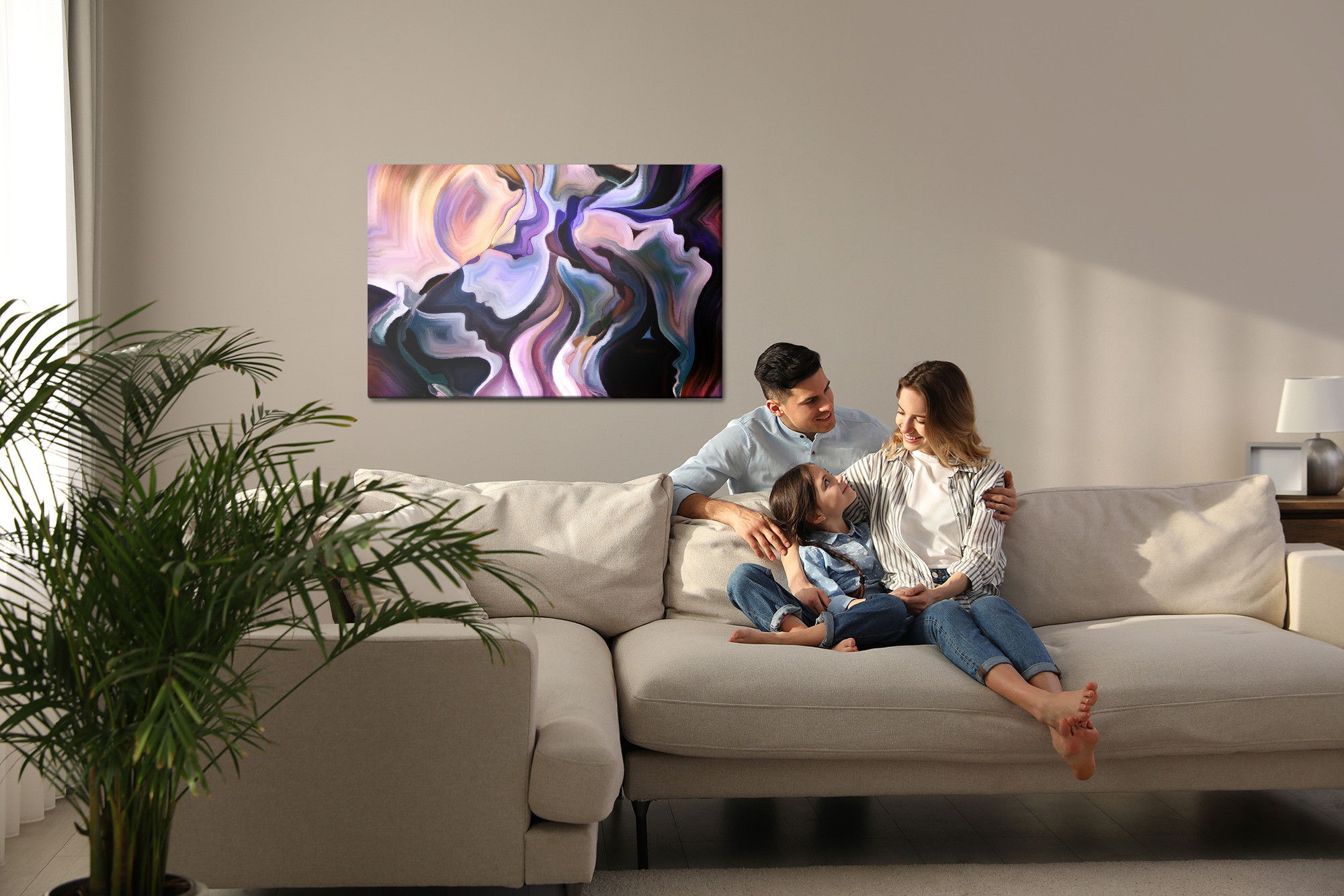 Varje tavla monteras på en massiv fururam. Format upp till 70×50 cm har en ram på 15 mm, medan format från 90×60 cm och uppåt har en ram på 20 mm. Den exakta dukspänningen gör att tavlan håller sin form över tid. Motivet Abstraction and faces trycks runt hela ramen vilket ger ett stilrent galleriuttryck där tavlan är lika vacker från sidan som framifrån. Kombinationen av rak dukspänning, rena linjer och korrekt tryck ger en professionell finish.