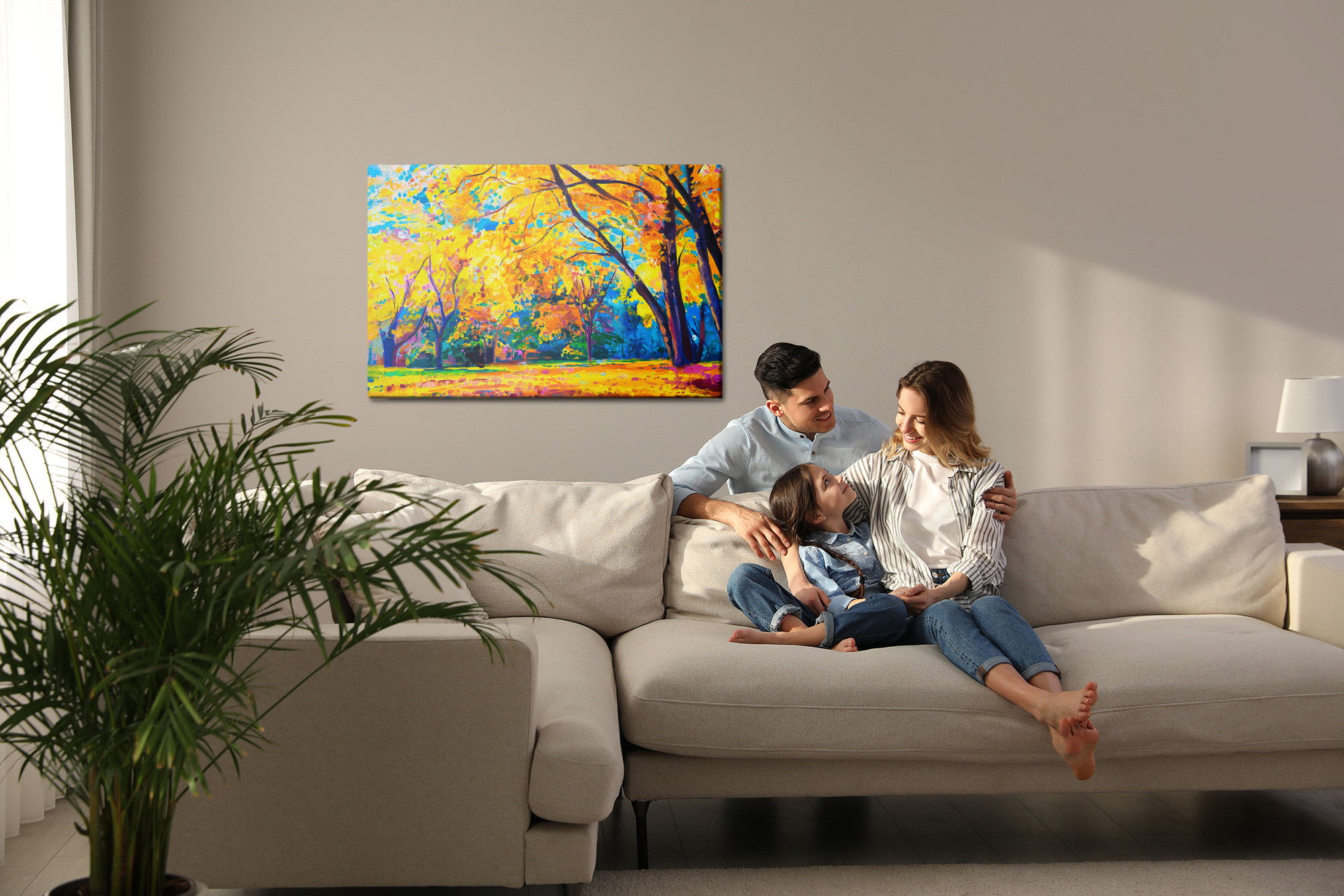 Motivet Autumn forest landscape återges med hög färgprecision och detaljrikedom tack vare HP Latex-teknologi. Trycket sker med vattenbaserade, luktfria och GREENGUARD Gold-certifierade bläck som ger en upplösning på upp till 300 DPI. Färgerna är UV-beständiga och behåller sin styrka även i ljusa rum, vilket gör tavlan lämplig för både hem- och offentliga miljöer.