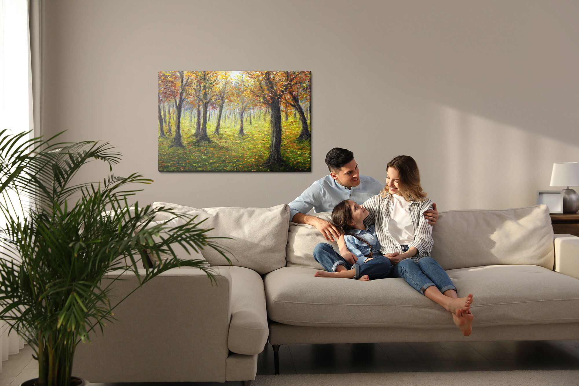 Varje tavla monteras på en massiv fururam. Format upp till 70×50 cm har en ram på 15 mm, medan format från 90×60 cm och uppåt har en ram på 20 mm. Den exakta dukspänningen gör att tavlan håller sin form över tid. Motivet Autumn forest landscape trycks runt hela ramen vilket ger ett stilrent galleriuttryck där tavlan är lika vacker från sidan som framifrån. Kombinationen av rak dukspänning, rena linjer och korrekt tryck ger en professionell finish.