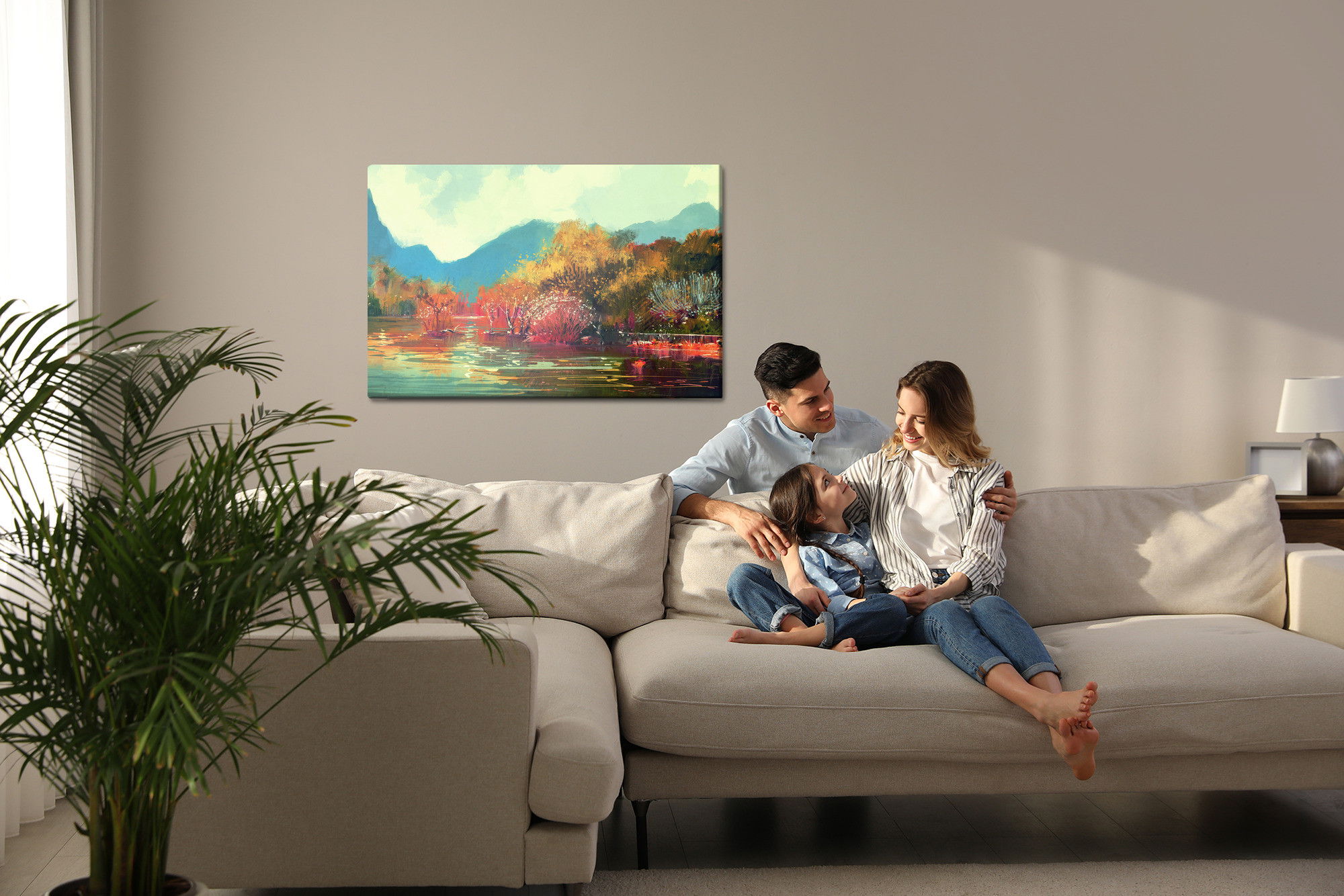 Motivet Autumn landscape as if återges med hög färgprecision och detaljrikedom tack vare HP Latex-teknologi. Trycket sker med vattenbaserade, luktfria och GREENGUARD Gold-certifierade bläck som ger en upplösning på upp till 300 DPI. Färgerna är UV-beständiga och behåller sin styrka även i ljusa rum, vilket gör tavlan lämplig för både hem- och offentliga miljöer.