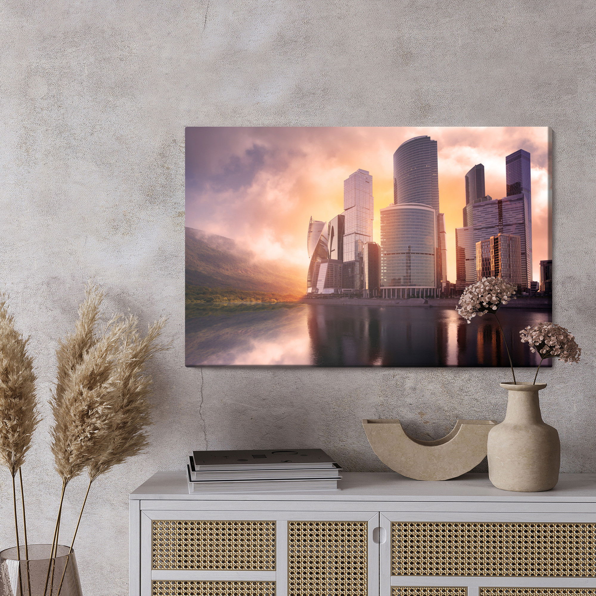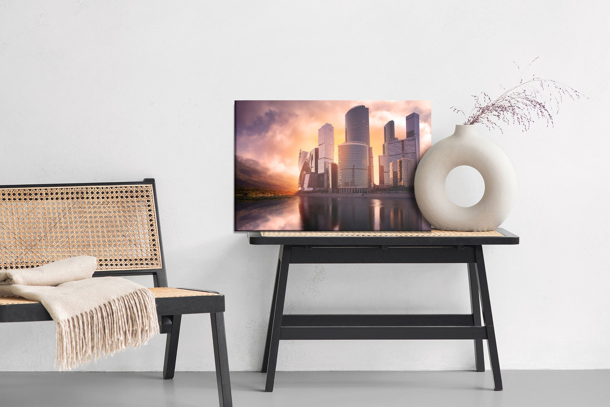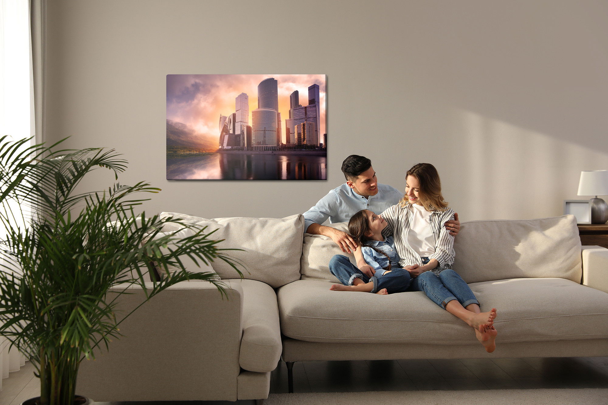 Varje tavla monteras på en massiv fururam. Format upp till 70×50 cm har en ram på 15 mm, medan format från 90×60 cm och uppåt har en ram på 20 mm. Den exakta dukspänningen gör att tavlan håller sin form över tid. Motivet Beautiful modern buildings trycks runt hela ramen vilket ger ett stilrent galleriuttryck där tavlan är lika vacker från sidan som framifrån. Kombinationen av rak dukspänning, rena linjer och korrekt tryck ger en professionell finish.
