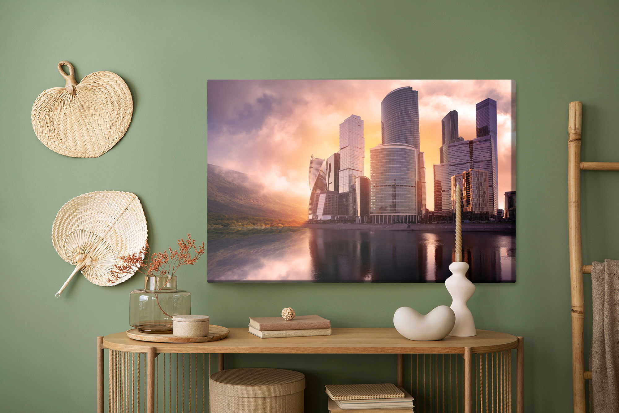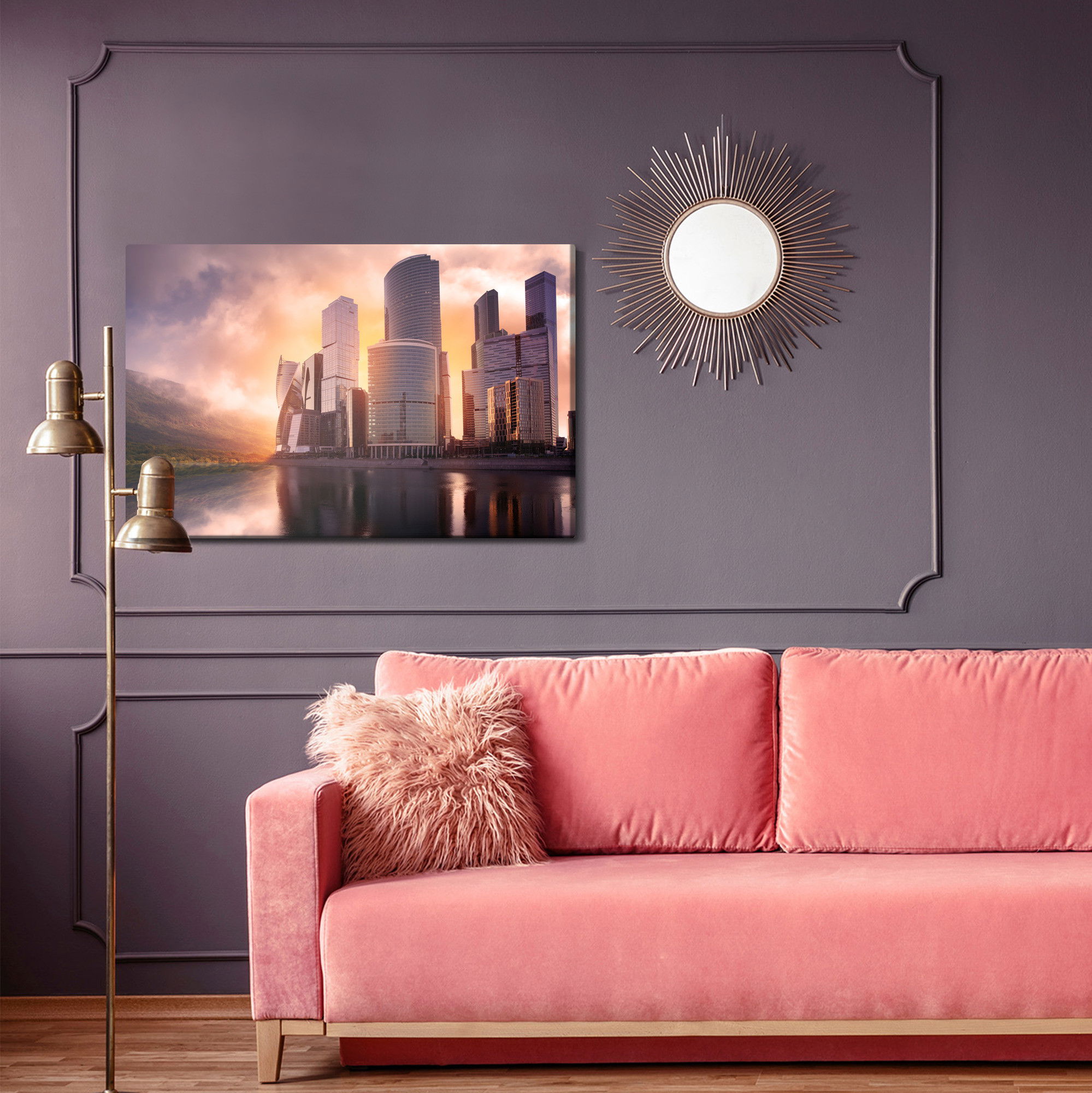 Motivet Beautiful modern buildings återges med hög färgprecision och detaljrikedom tack vare HP Latex-teknologi. Trycket sker med vattenbaserade, luktfria och GREENGUARD Gold-certifierade bläck som ger en upplösning på upp till 300 DPI. Färgerna är UV-beständiga och behåller sin styrka även i ljusa rum, vilket gör tavlan lämplig för både hem- och offentliga miljöer.