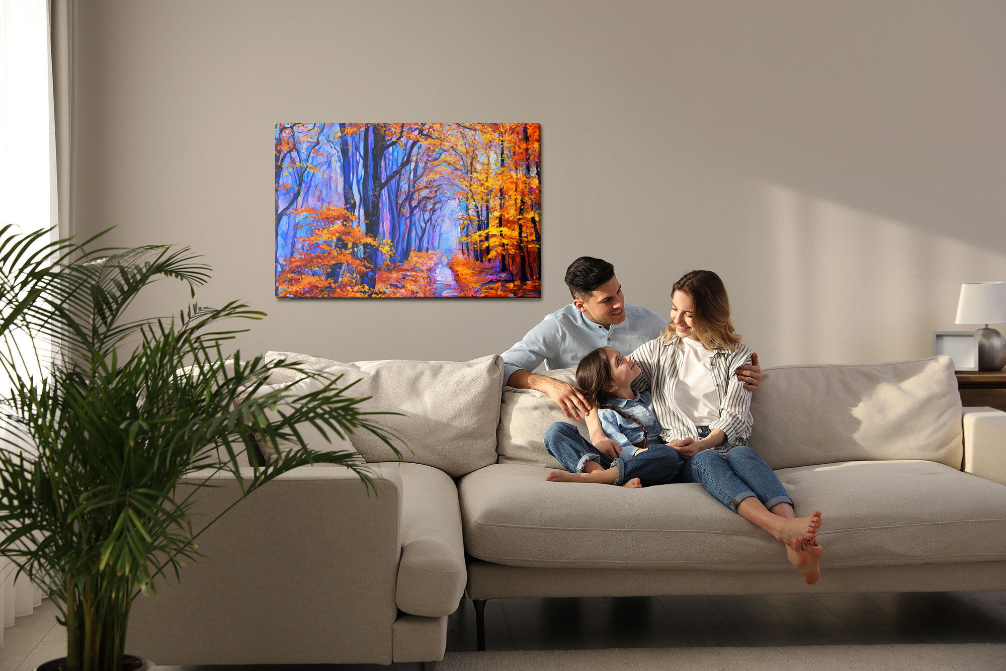 Motivet Blue-orange forest återges med hög färgprecision och detaljrikedom tack vare HP Latex-teknologi. Trycket sker med vattenbaserade, luktfria och GREENGUARD Gold-certifierade bläck som ger en upplösning på upp till 300 DPI. Färgerna är UV-beständiga och behåller sin styrka även i ljusa rum, vilket gör tavlan lämplig för både hem- och offentliga miljöer.