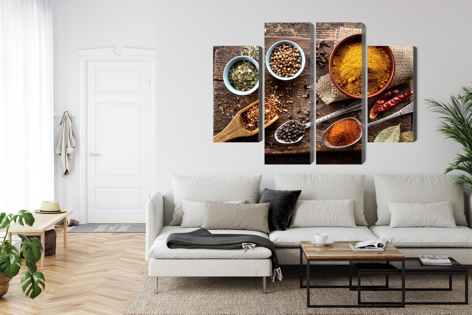Varje tavla monteras på en massiv fururam. Format upp till 70×50 cm har en ram på 15 mm, medan format från 90×60 cm och uppåt har en ram på 20 mm. Den exakta dukspänningen gör att tavlan håller sin form över tid. Motivet Board with various spices trycks runt hela ramen vilket ger ett stilrent galleriuttryck där tavlan är lika vacker från sidan som framifrån. Kombinationen av rak dukspänning, rena linjer och korrekt tryck ger en professionell finish.
