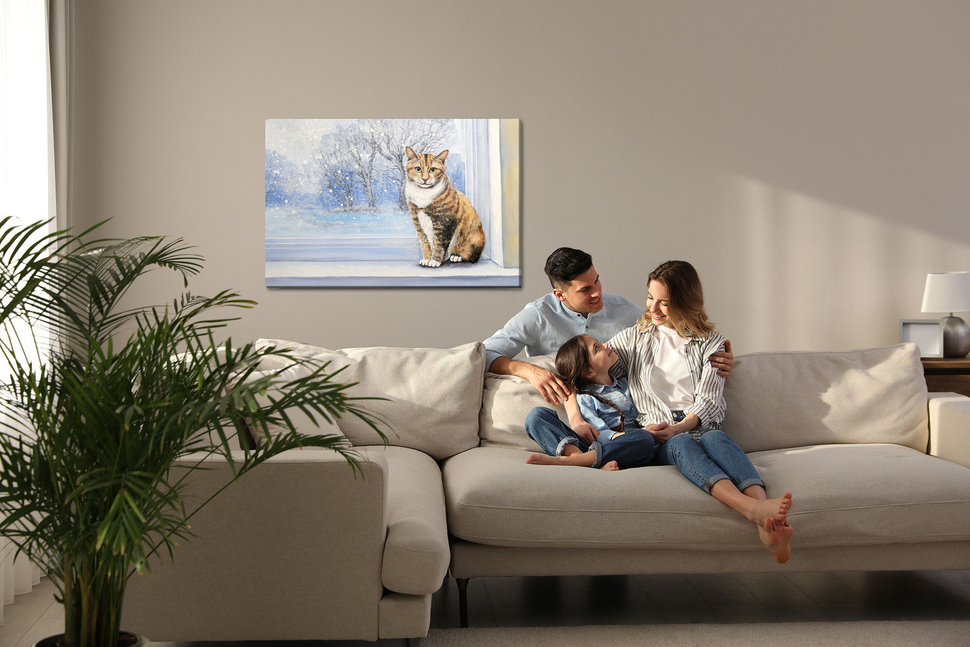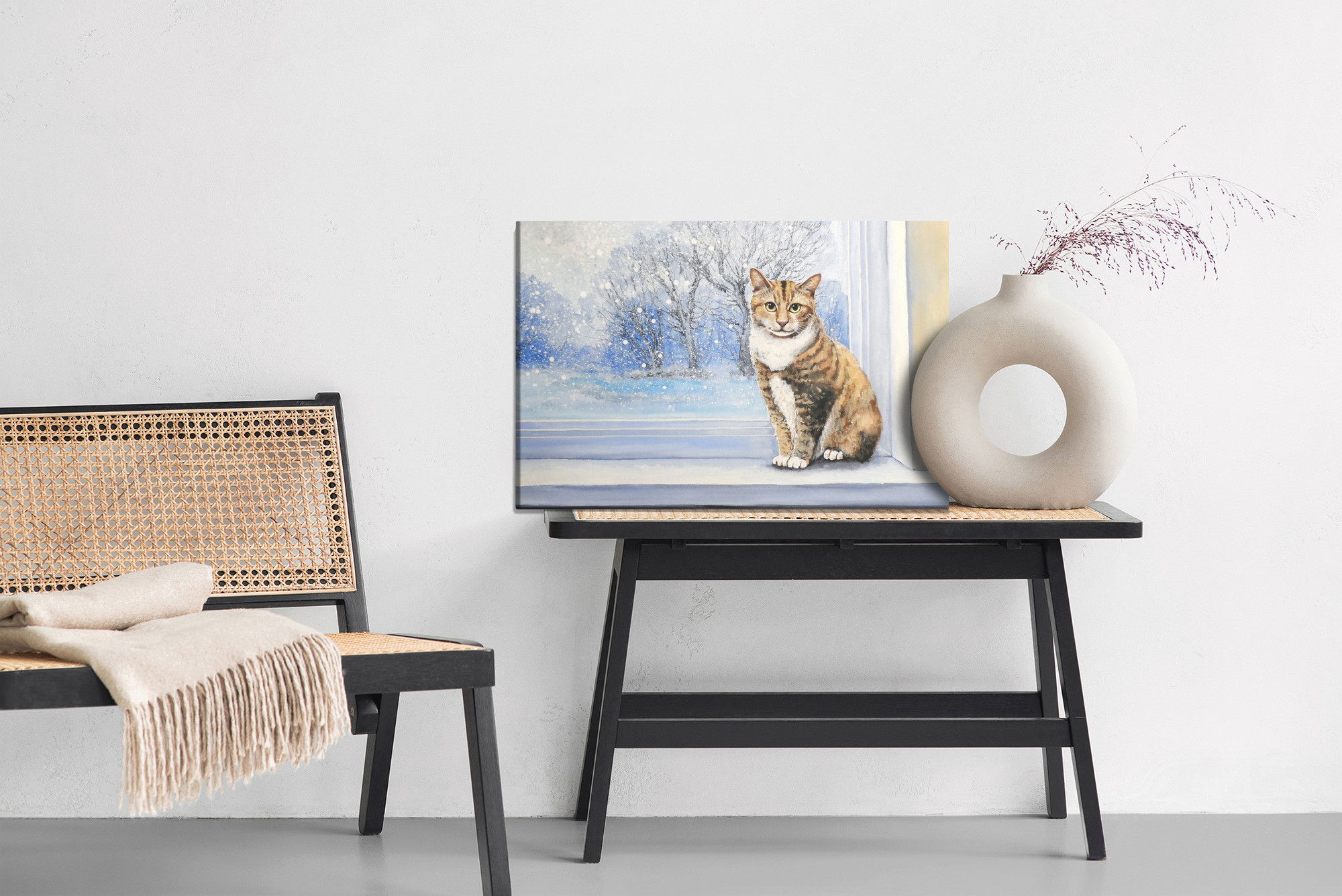 Varje tavla monteras på en massiv fururam. Format upp till 70×50 cm har en ram på 15 mm, medan format från 90×60 cm och uppåt har en ram på 20 mm. Den exakta dukspänningen gör att tavlan håller sin form över tid. Motivet Cat on the background trycks runt hela ramen vilket ger ett stilrent galleriuttryck där tavlan är lika vacker från sidan som framifrån. Kombinationen av rak dukspänning, rena linjer och korrekt tryck ger en professionell finish.