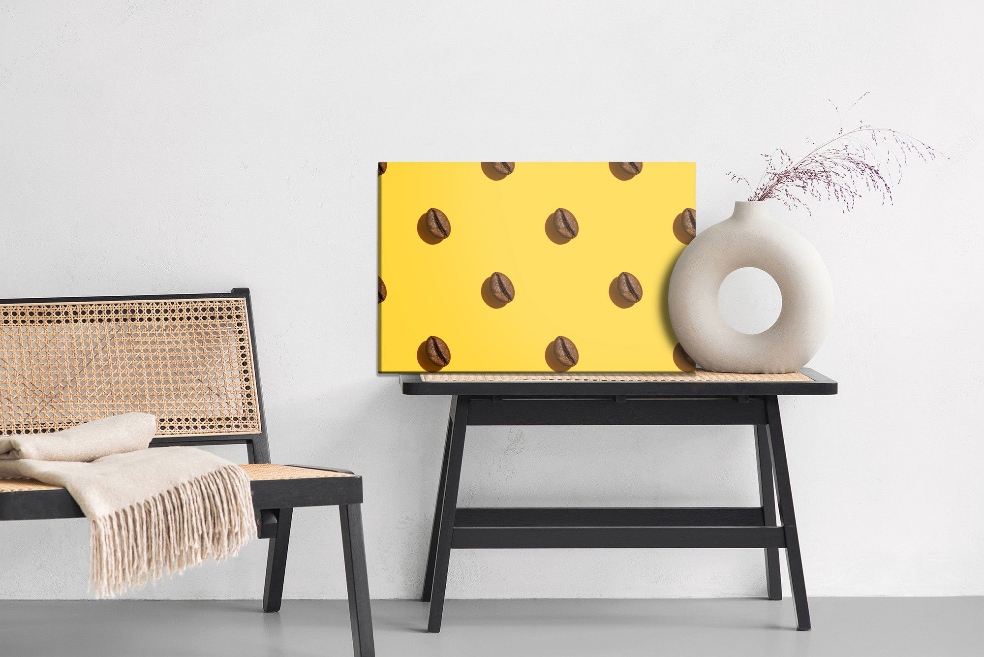 Ljuddämpande tavla – Coffee beans on a yellow för lugnare rum och mjukare akustik