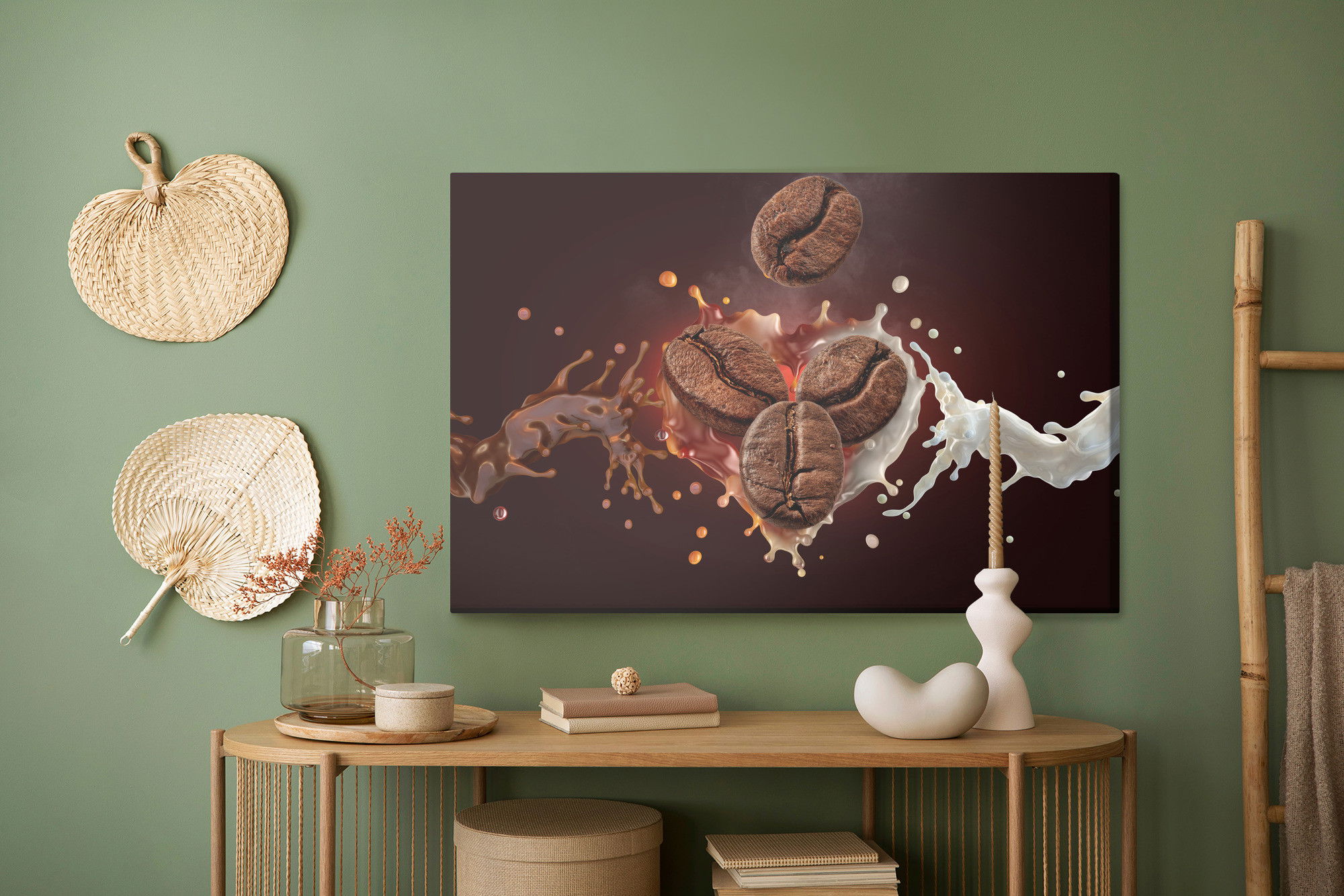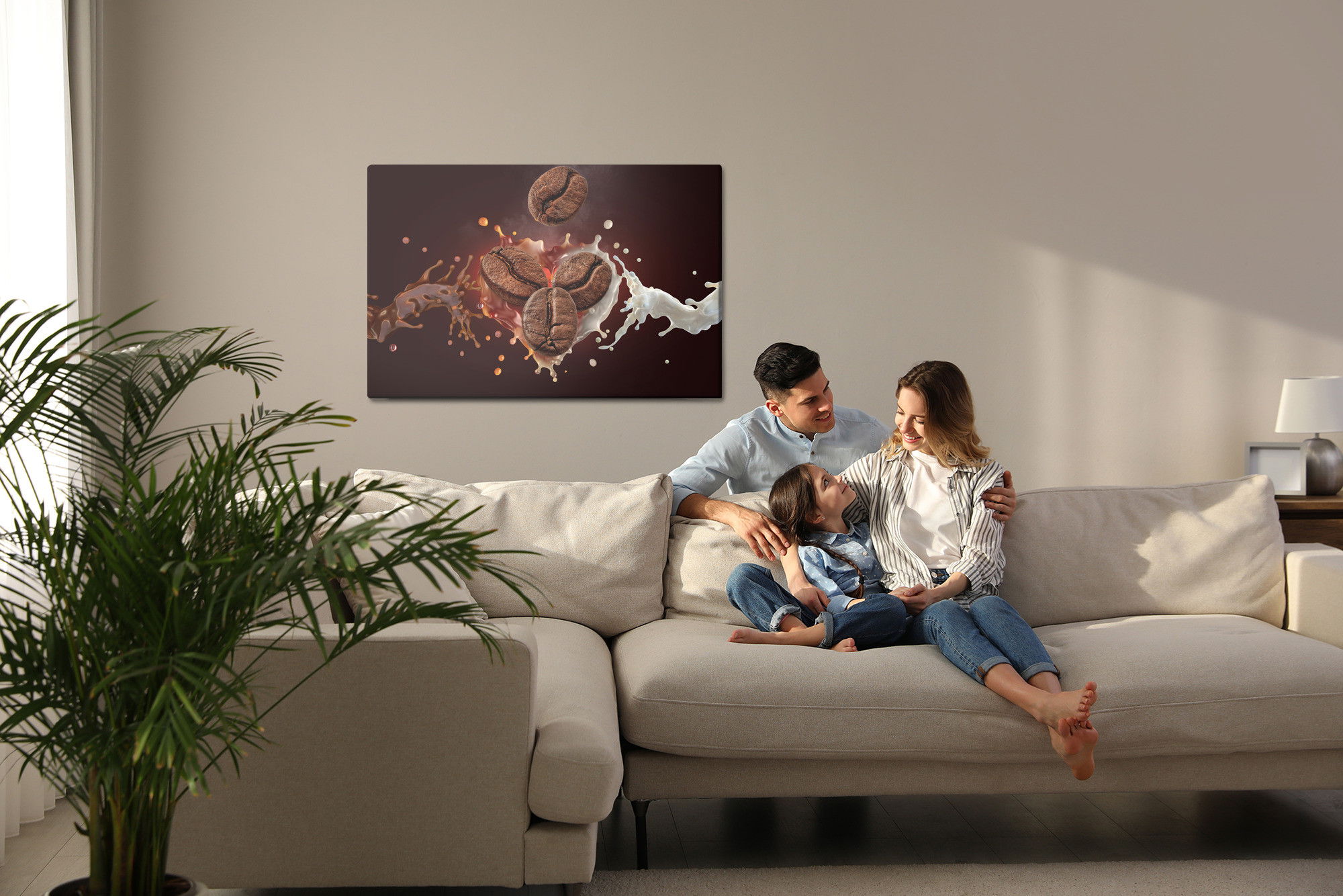 Varje tavla monteras på en massiv fururam. Format upp till 70×50 cm har en ram på 15 mm, medan format från 90×60 cm och uppåt har en ram på 20 mm. Den exakta dukspänningen gör att tavlan håller sin form över tid. Motivet Coffee with milk trycks runt hela ramen vilket ger ett stilrent galleriuttryck där tavlan är lika vacker från sidan som framifrån. Kombinationen av rak dukspänning, rena linjer och korrekt tryck ger en professionell finish.