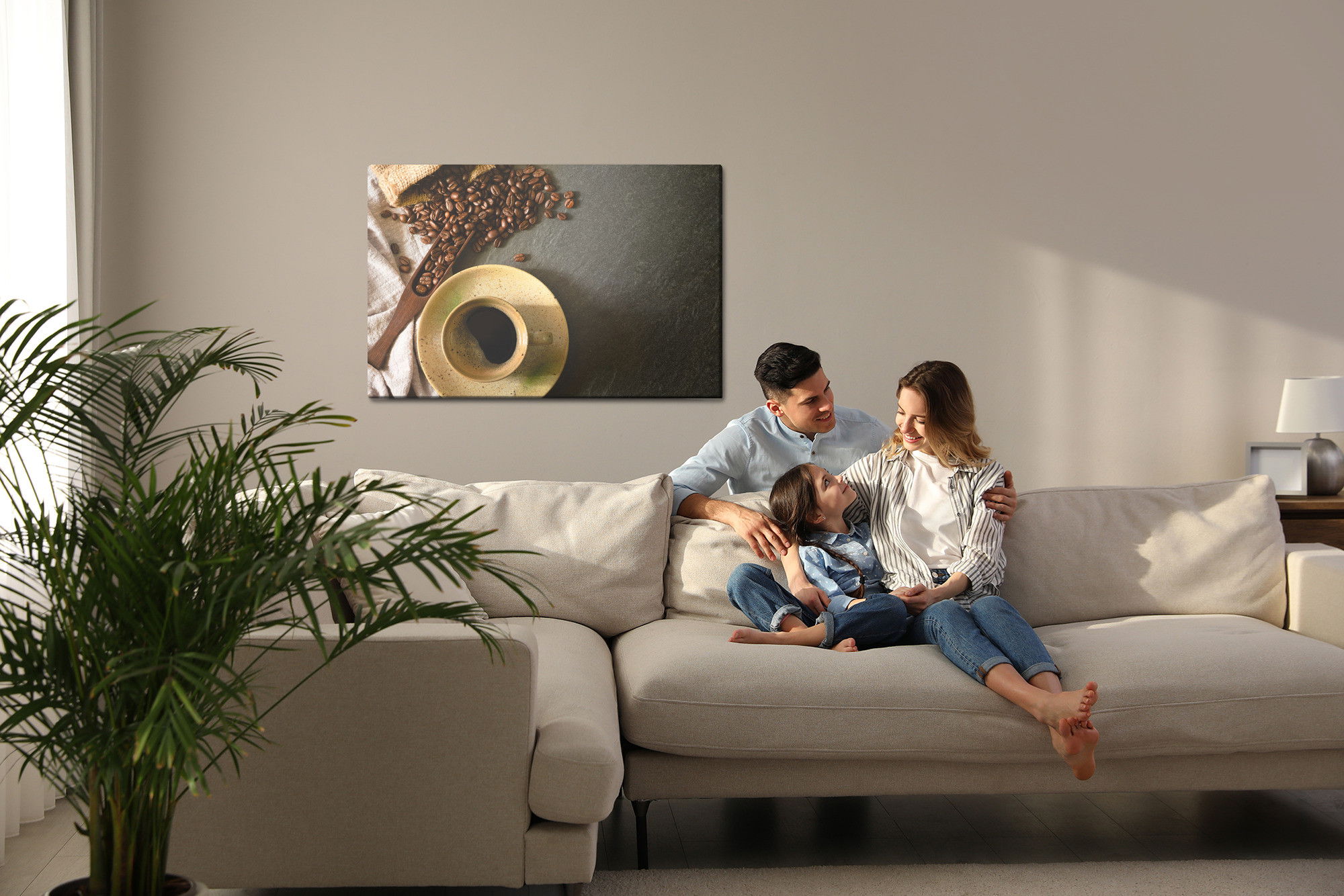 Varje tavla monteras på en massiv fururam. Format upp till 70×50 cm har en ram på 15 mm, medan format från 90×60 cm och uppåt har en ram på 20 mm. Den exakta dukspänningen gör att tavlan håller sin form över tid. Motivet Coffee with milk foam trycks runt hela ramen vilket ger ett stilrent galleriuttryck där tavlan är lika vacker från sidan som framifrån. Kombinationen av rak dukspänning, rena linjer och korrekt tryck ger en professionell finish.