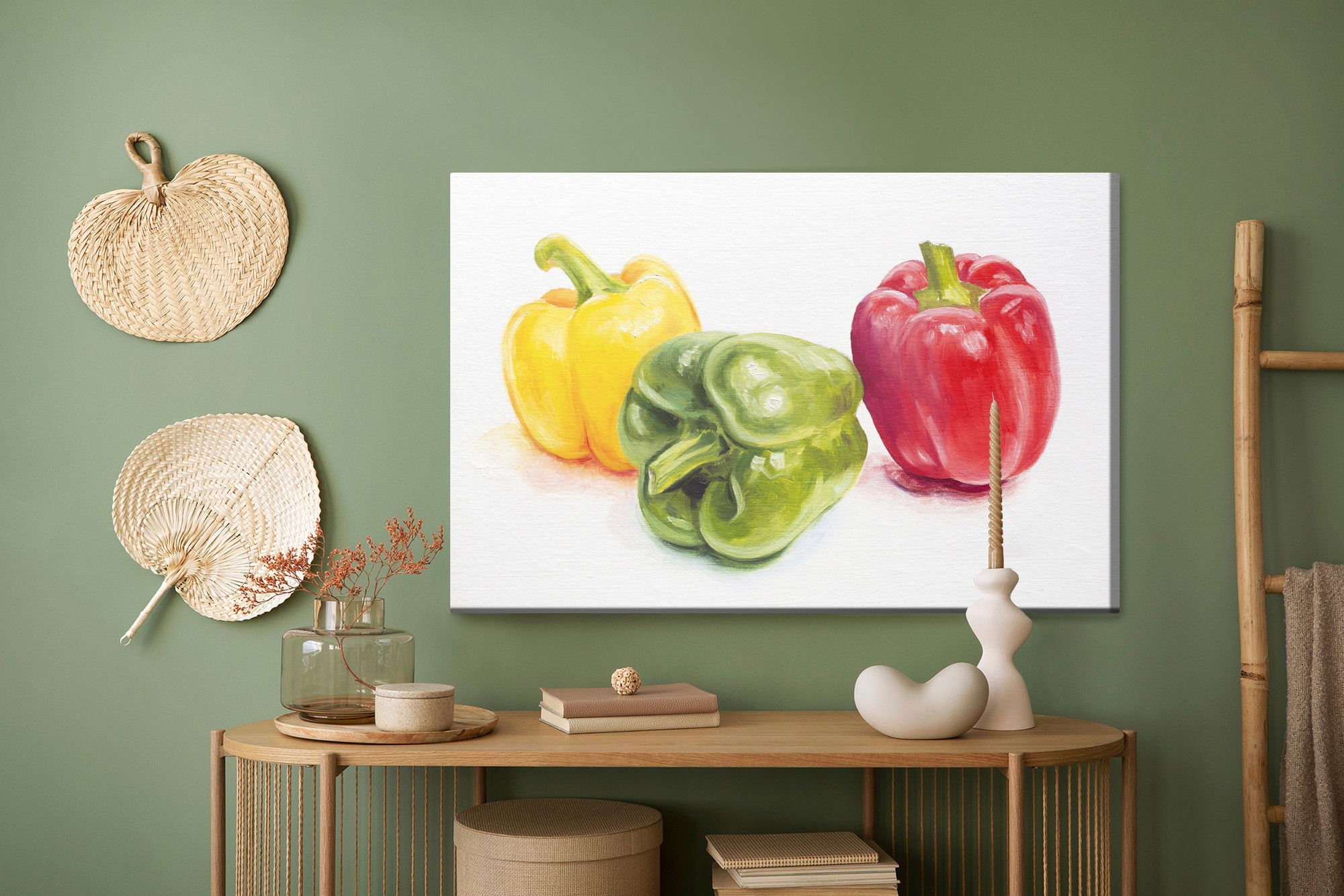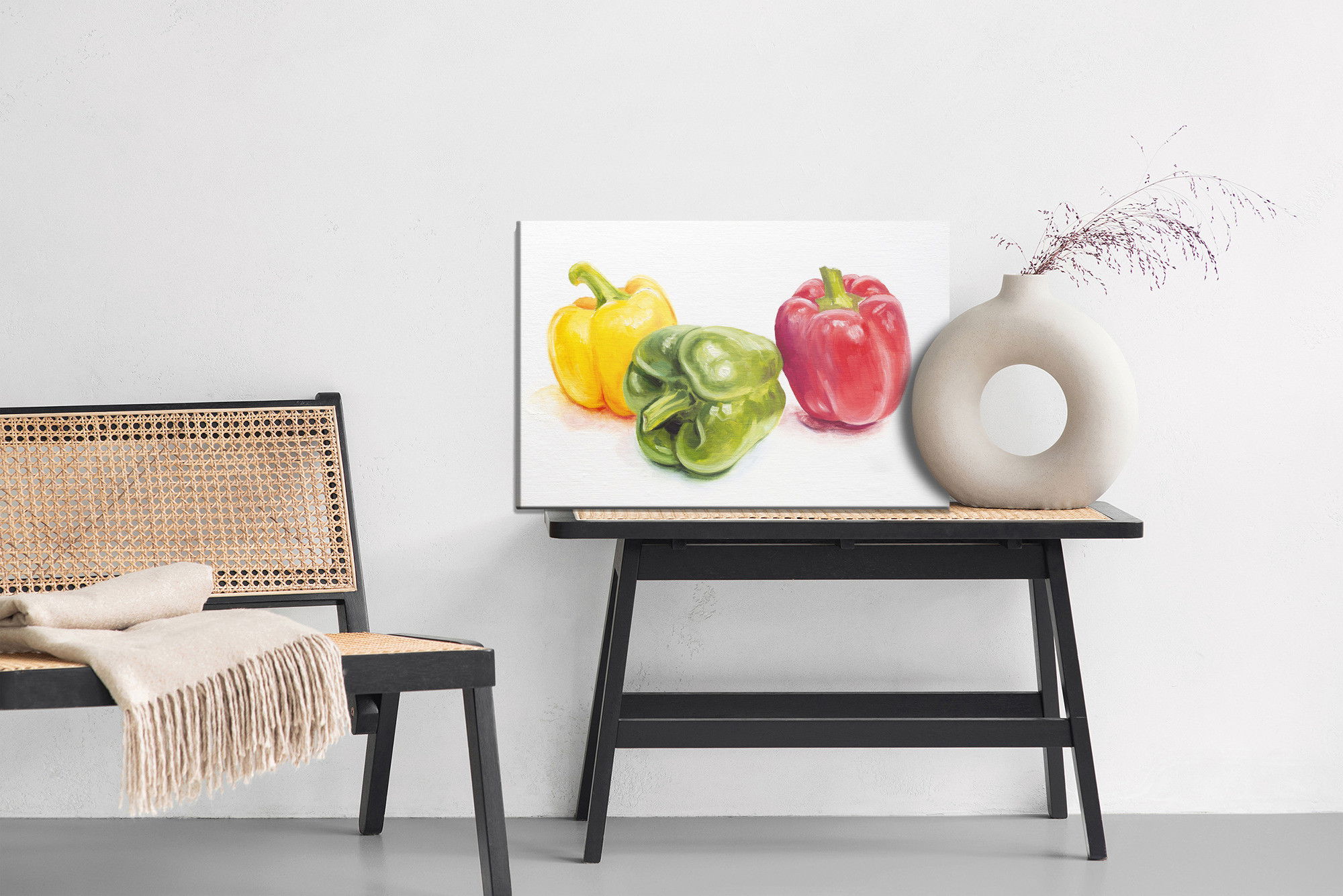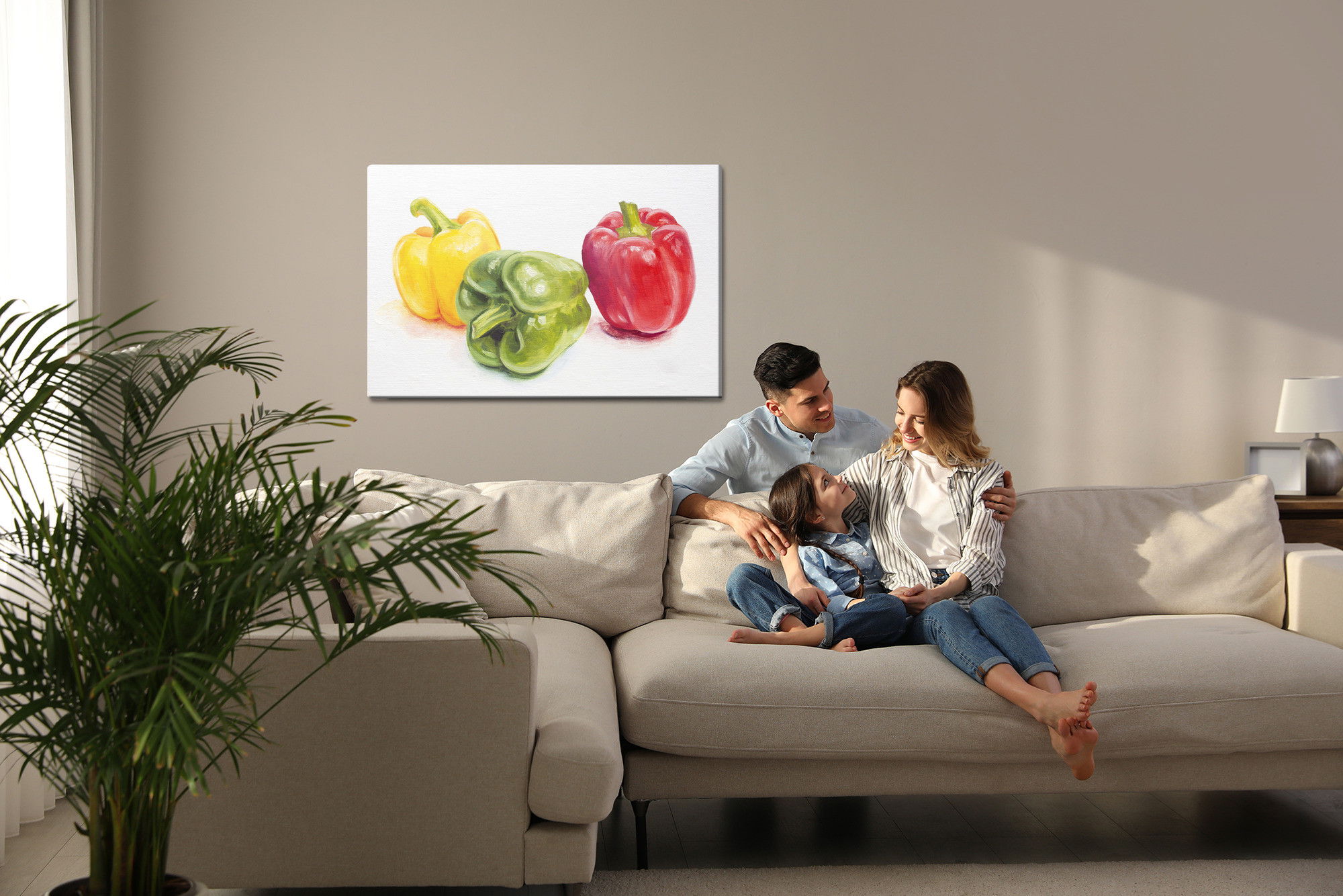 Varje tavla monteras på en massiv fururam. Format upp till 70×50 cm har en ram på 15 mm, medan format från 90×60 cm och uppåt har en ram på 20 mm. Den exakta dukspänningen gör att tavlan håller sin form över tid. Motivet Colorful peppers trycks runt hela ramen vilket ger ett stilrent galleriuttryck där tavlan är lika vacker från sidan som framifrån. Kombinationen av rak dukspänning, rena linjer och korrekt tryck ger en professionell finish.