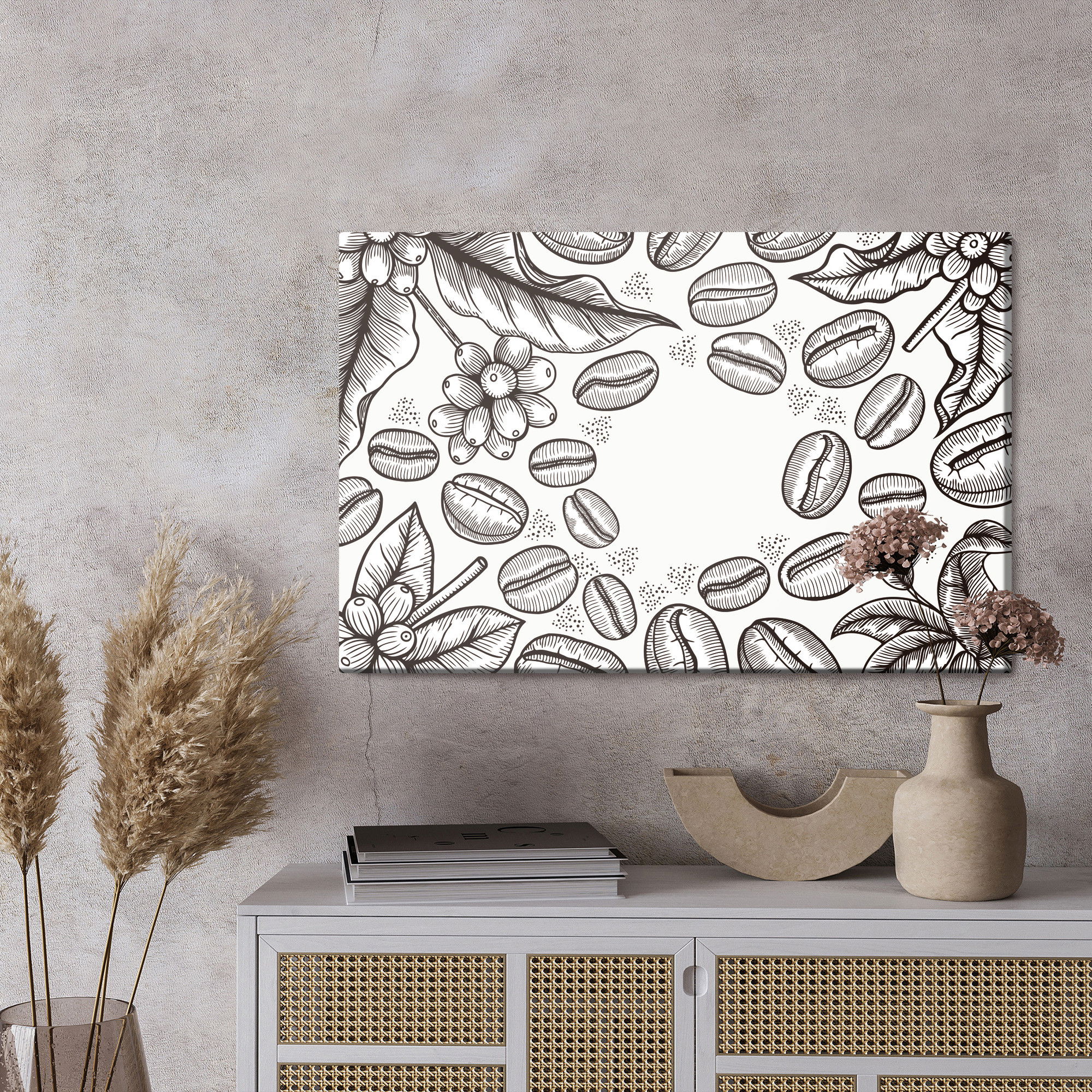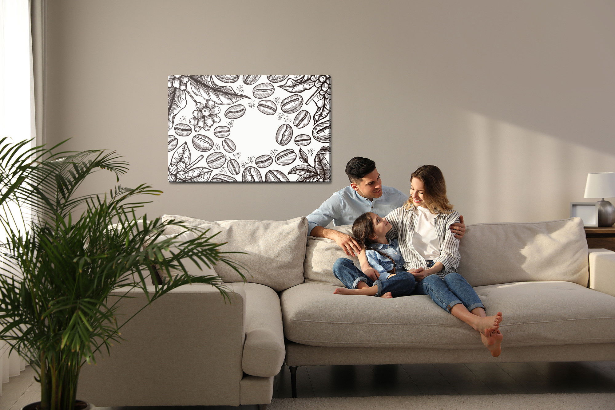 Varje tavla monteras på en massiv fururam. Format upp till 70×50 cm har en ram på 15 mm, medan format från 90×60 cm och uppåt har en ram på 20 mm. Den exakta dukspänningen gör att tavlan håller sin form över tid. Motivet Drawing coffee beans trycks runt hela ramen vilket ger ett stilrent galleriuttryck där tavlan är lika vacker från sidan som framifrån. Kombinationen av rak dukspänning, rena linjer och korrekt tryck ger en professionell finish.