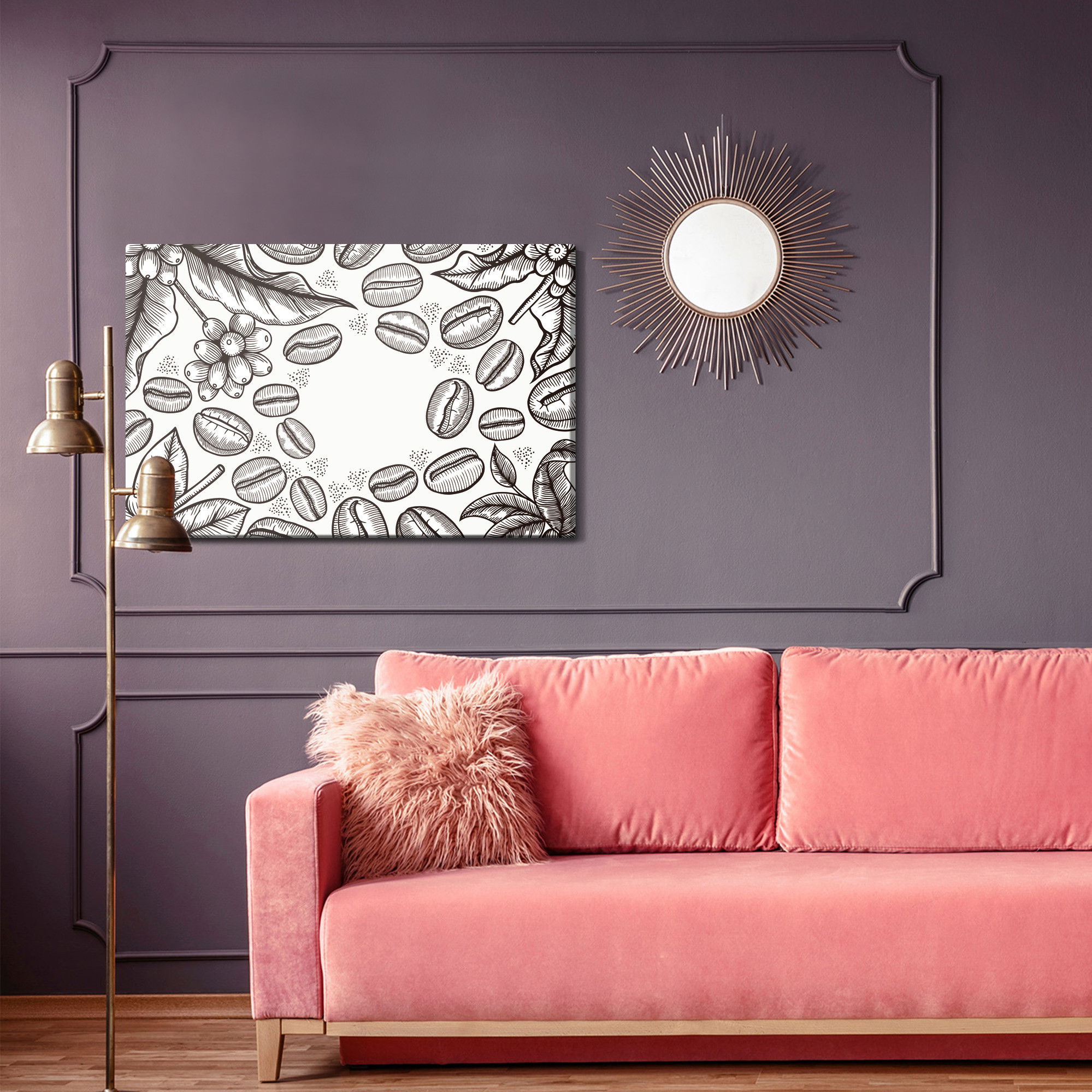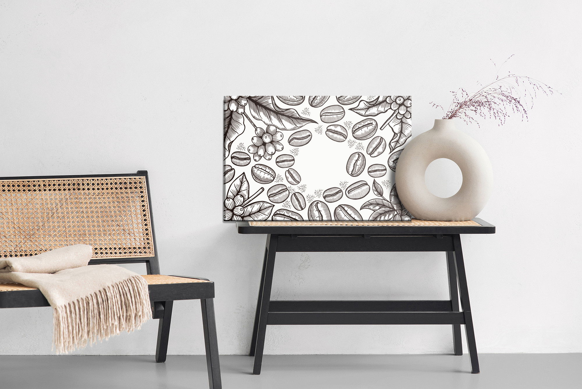 Varje tavla monteras på en massiv fururam. Format upp till 70×50 cm har en ram på 15 mm, medan format från 90×60 cm och uppåt har en ram på 20 mm. Den exakta dukspänningen gör att tavlan håller sin form över tid. Motivet Drawing coffee beans trycks runt hela ramen vilket ger ett stilrent galleriuttryck där tavlan är lika vacker från sidan som framifrån. Kombinationen av rak dukspänning, rena linjer och korrekt tryck ger en professionell finish.