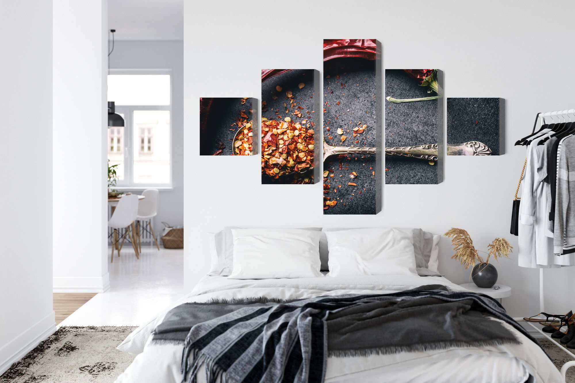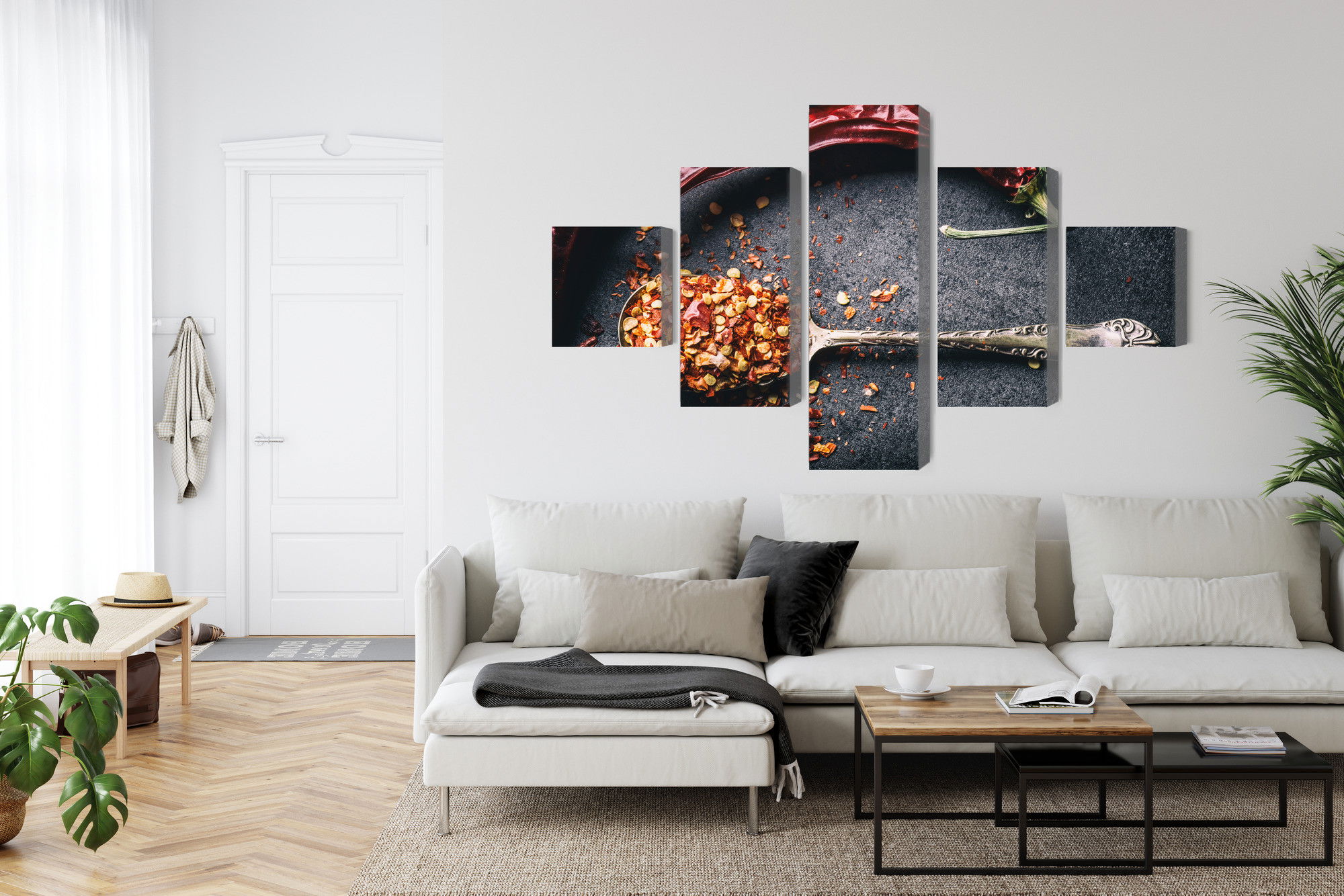 Varje tavla monteras på en massiv fururam. Format upp till 70×50 cm har en ram på 15 mm, medan format från 90×60 cm och uppåt har en ram på 20 mm. Den exakta dukspänningen gör att tavlan håller sin form över tid. Motivet Dried chili peppers trycks runt hela ramen vilket ger ett stilrent galleriuttryck där tavlan är lika vacker från sidan som framifrån. Kombinationen av rak dukspänning, rena linjer och korrekt tryck ger en professionell finish.