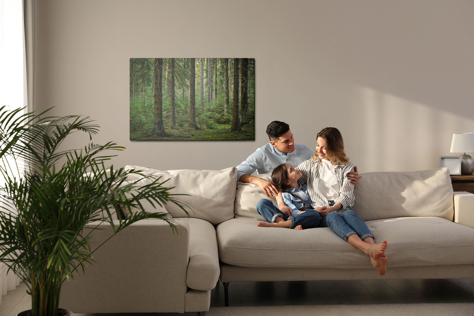 Motivet Forest 3d view återges med hög färgprecision och detaljrikedom tack vare HP Latex-teknologi. Trycket sker med vattenbaserade, luktfria och GREENGUARD Gold-certifierade bläck som ger en upplösning på upp till 300 DPI. Färgerna är UV-beständiga och behåller sin styrka även i ljusa rum, vilket gör tavlan lämplig för både hem- och offentliga miljöer.