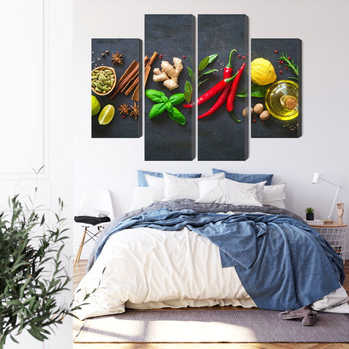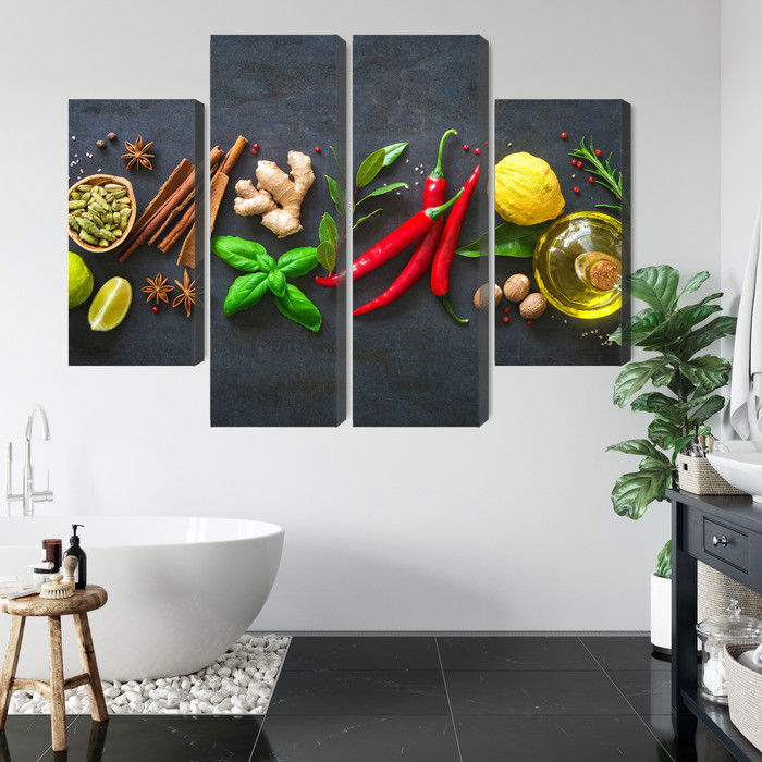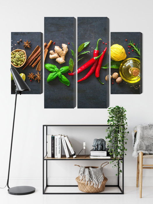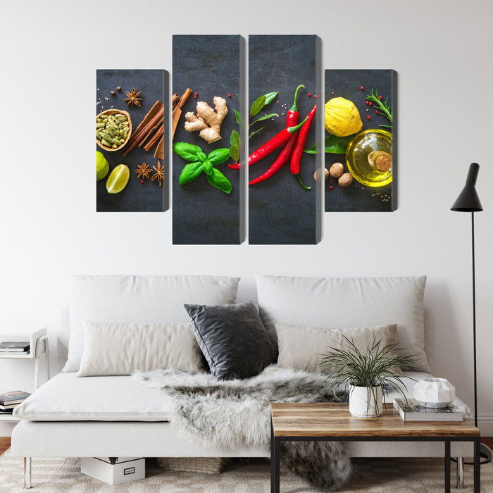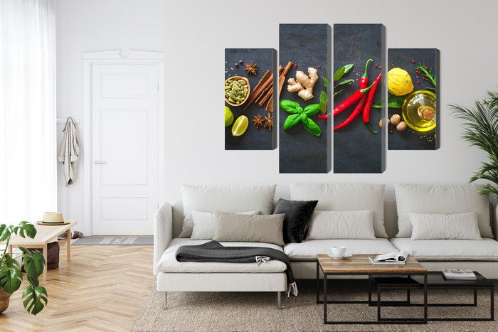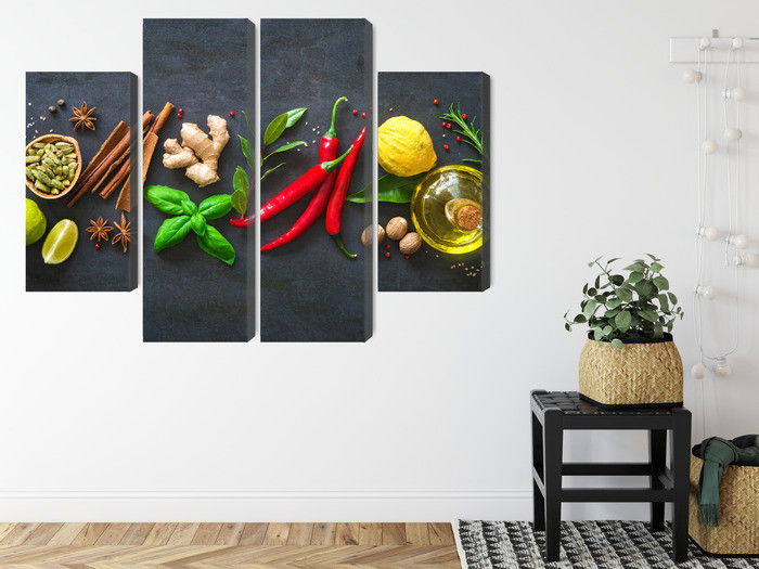 Motivet Fresh aromatic spices återges med hög färgprecision och detaljrikedom tack vare HP Latex-teknologi. Trycket sker med vattenbaserade, luktfria och GREENGUARD Gold-certifierade bläck som ger en upplösning på upp till 300 DPI. Färgerna är UV-beständiga och behåller sin styrka även i ljusa rum, vilket gör tavlan lämplig för både hem- och offentliga miljöer.