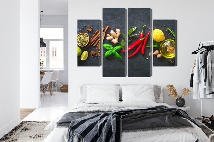 SilentDirects ljuddämpande tavla Fresh aromatic spices kombinerar ett högupplöst motiv med avancerad akustikteknik. Varje tavla monteras i Sverige och bygger på en stabil canvastavla med fururam, där insidan av ramen fylls med en ljudabsorberande kärna av återvunnen polyester. Konstruktionen gör tavlan till ett både estetiskt och funktionellt inslag i rummet.