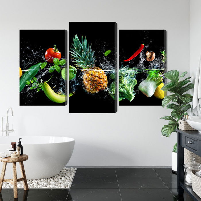 Motivet Fresh vegetables in the water återges med hög färgprecision och detaljrikedom tack vare HP Latex-teknologi. Trycket sker med vattenbaserade, luktfria och GREENGUARD Gold-certifierade bläck som ger en upplösning på upp till 300 DPI. Färgerna är UV-beständiga och behåller sin styrka även i ljusa rum, vilket gör tavlan lämplig för både hem- och offentliga miljöer.