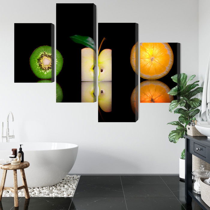 Motivet Fruit halves återges med hög färgprecision och detaljrikedom tack vare HP Latex-teknologi. Trycket sker med vattenbaserade, luktfria och GREENGUARD Gold-certifierade bläck som ger en upplösning på upp till 300 DPI. Färgerna är UV-beständiga och behåller sin styrka även i ljusa rum, vilket gör tavlan lämplig för både hem- och offentliga miljöer.