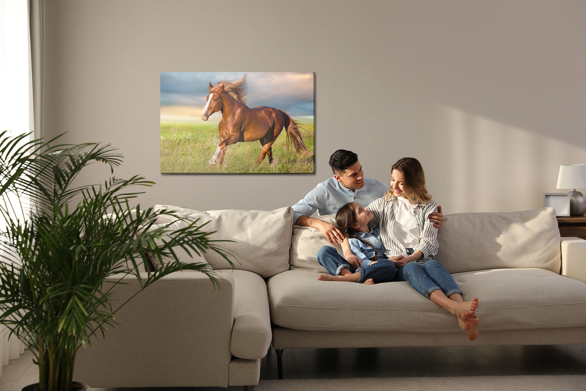 Varje tavla monteras på en massiv fururam. Format upp till 70×50 cm har en ram på 15 mm, medan format från 90×60 cm och uppåt har en ram på 20 mm. Den exakta dukspänningen gör att tavlan håller sin form över tid. Motivet Galloping horse trycks runt hela ramen vilket ger ett stilrent galleriuttryck där tavlan är lika vacker från sidan som framifrån. Kombinationen av rak dukspänning, rena linjer och korrekt tryck ger en professionell finish.