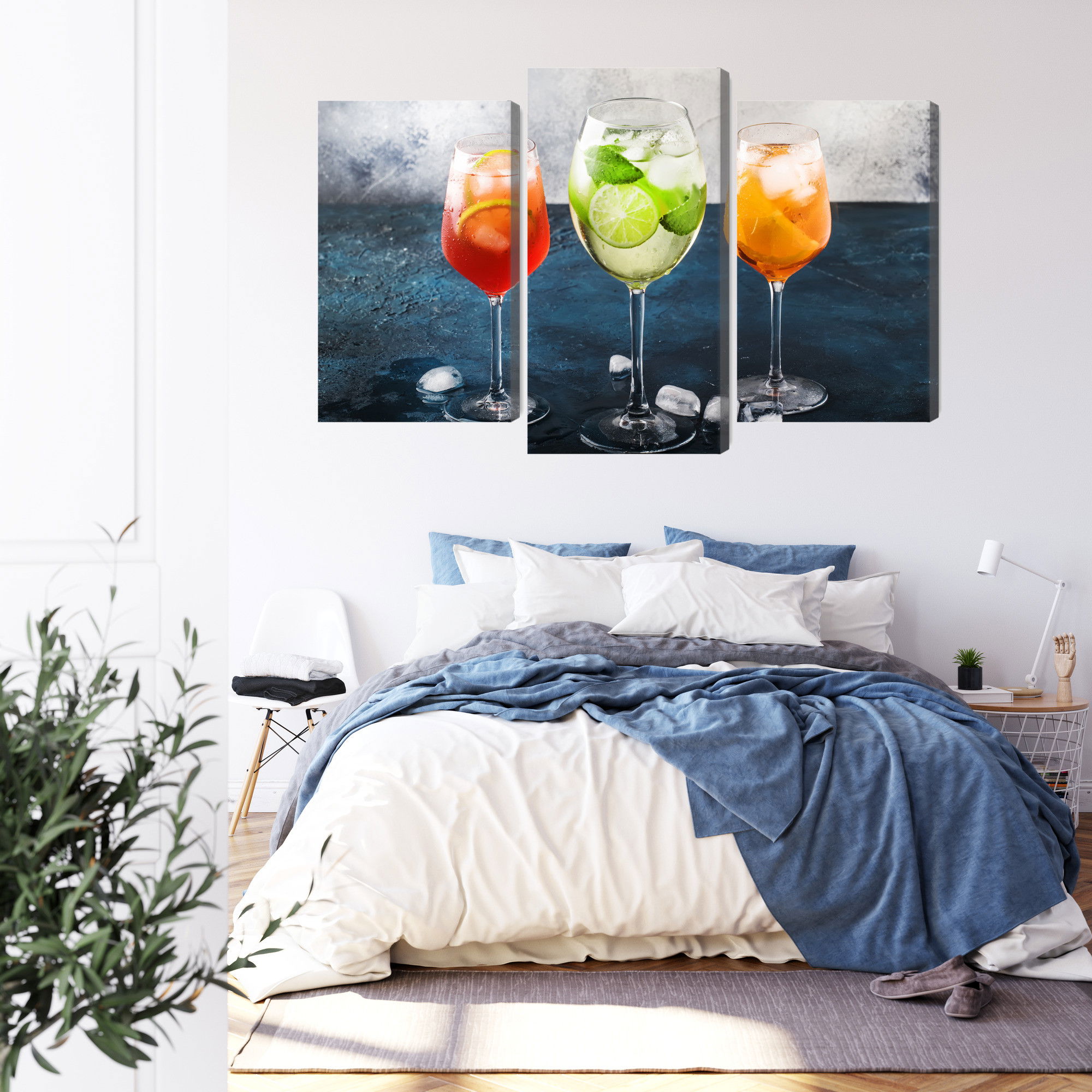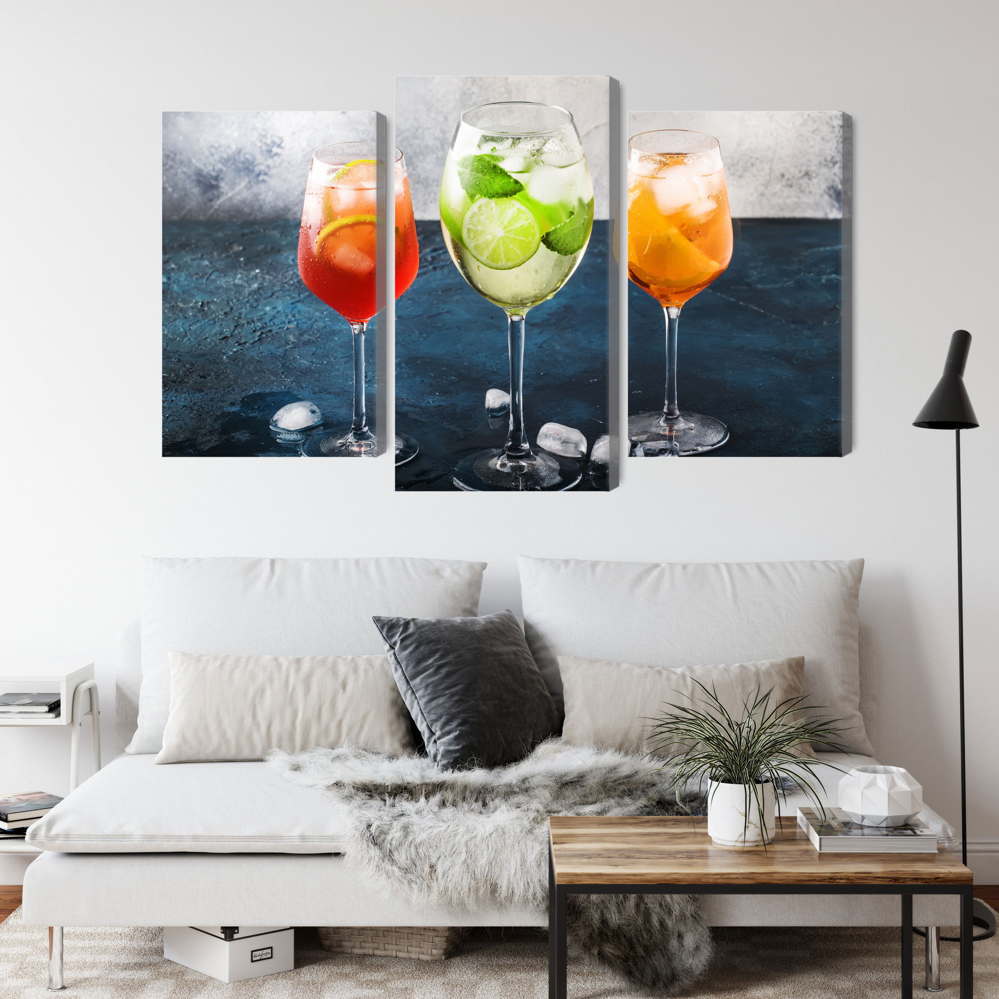 Varje tavla monteras på en massiv fururam. Format upp till 70×50 cm har en ram på 15 mm, medan format från 90×60 cm och uppåt har en ram på 20 mm. Den exakta dukspänningen gör att tavlan håller sin form över tid. Motivet Glasses with summer cocktails trycks runt hela ramen vilket ger ett stilrent galleriuttryck där tavlan är lika vacker från sidan som framifrån. Kombinationen av rak dukspänning, rena linjer och korrekt tryck ger en professionell finish.