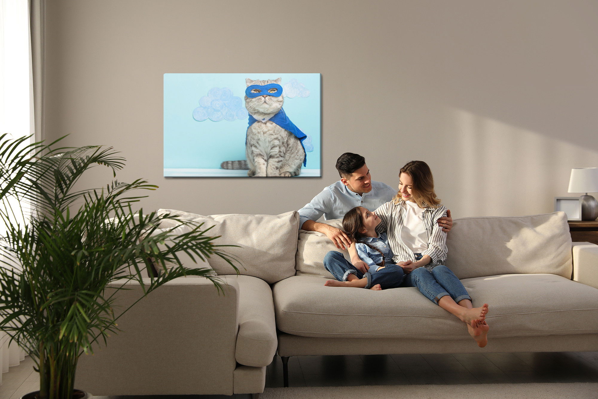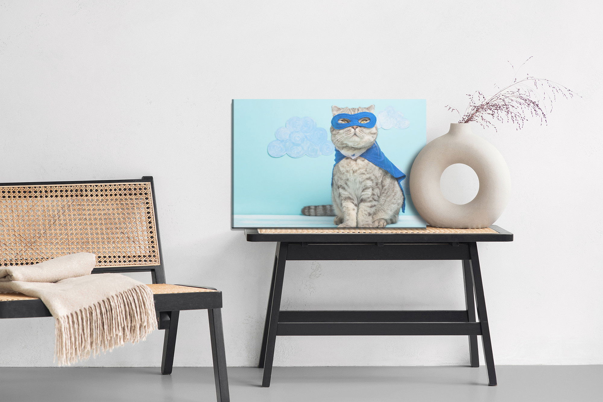 Motivet Gray cat with a mask återges med hög färgprecision och detaljrikedom tack vare HP Latex-teknologi. Trycket sker med vattenbaserade, luktfria och GREENGUARD Gold-certifierade bläck som ger en upplösning på upp till 300 DPI. Färgerna är UV-beständiga och behåller sin styrka även i ljusa rum, vilket gör tavlan lämplig för både hem- och offentliga miljöer.
