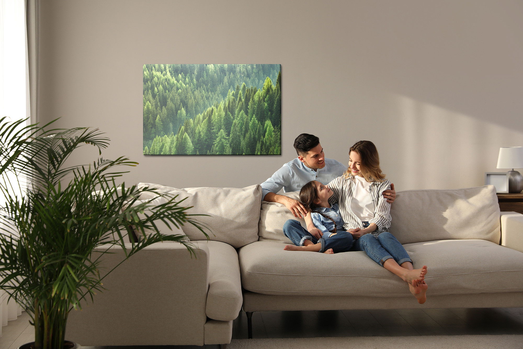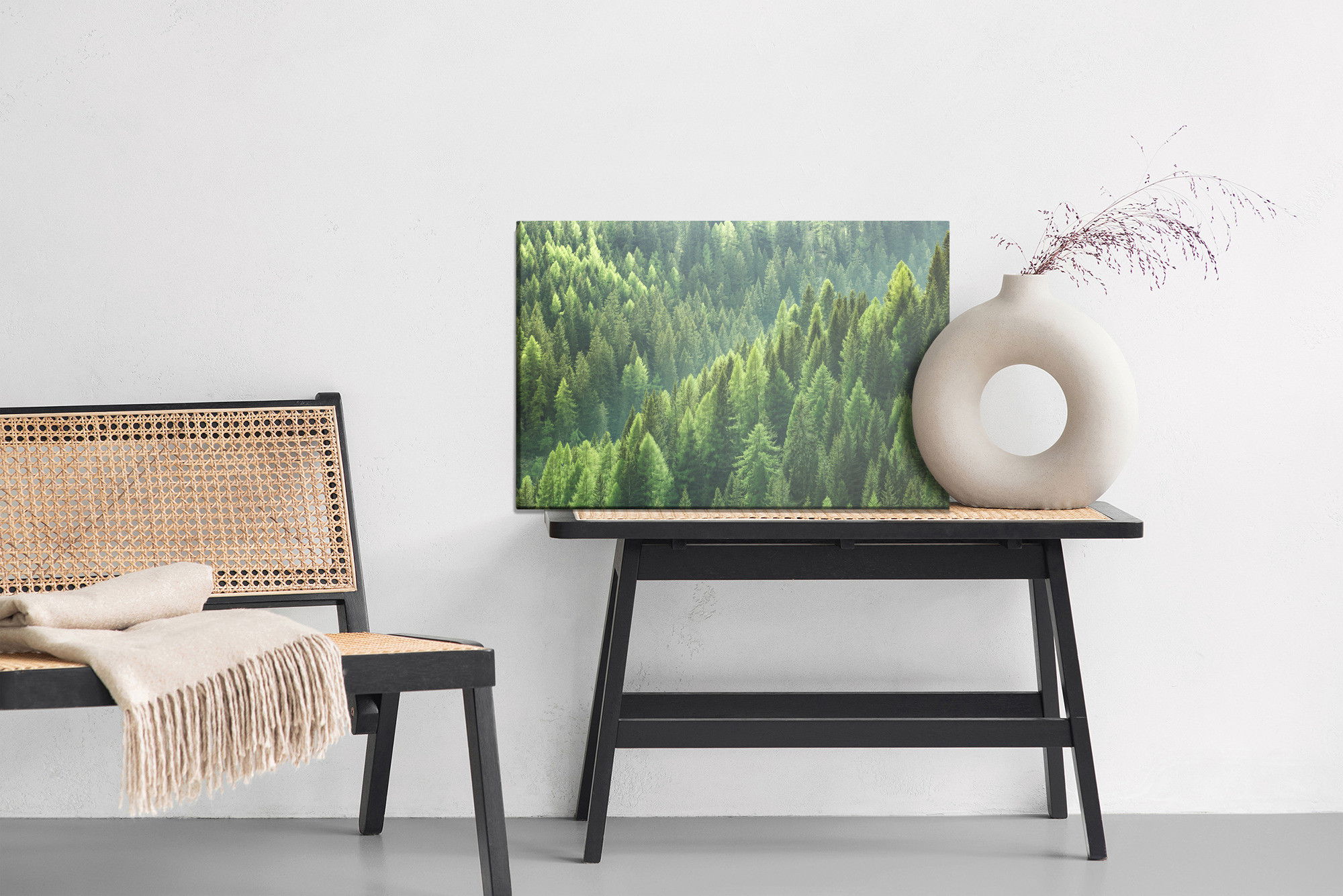 Varje tavla monteras på en massiv fururam. Format upp till 70×50 cm har en ram på 15 mm, medan format från 90×60 cm och uppåt har en ram på 20 mm. Den exakta dukspänningen gör att tavlan håller sin form över tid. Motivet Green coniferous forest trycks runt hela ramen vilket ger ett stilrent galleriuttryck där tavlan är lika vacker från sidan som framifrån. Kombinationen av rak dukspänning, rena linjer och korrekt tryck ger en professionell finish.