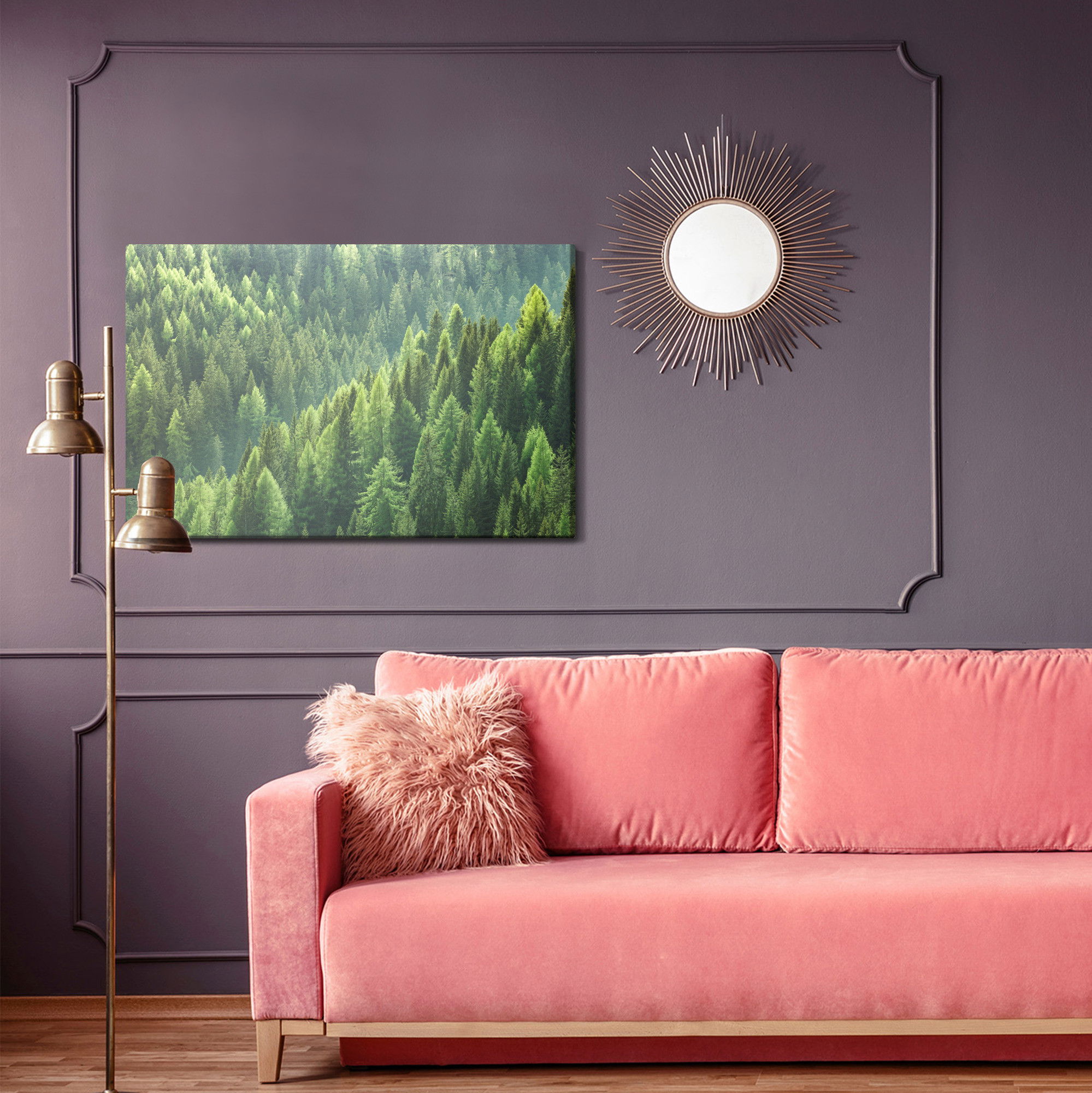 SilentDirects ljuddämpande tavla Green coniferous forest kombinerar ett högupplöst motiv med avancerad akustikteknik. Varje tavla monteras i Sverige och bygger på en stabil canvastavla med fururam, där insidan av ramen fylls med en ljudabsorberande kärna av återvunnen polyester. Konstruktionen gör tavlan till ett både estetiskt och funktionellt inslag i rummet.