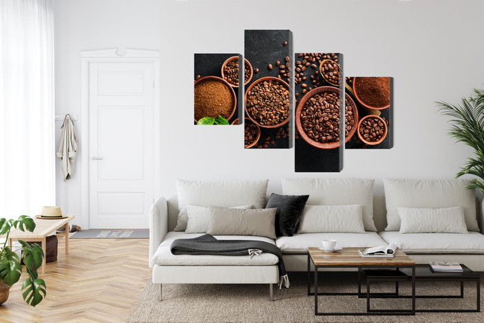 Varje tavla monteras på en massiv fururam. Format upp till 70×50 cm har en ram på 15 mm, medan format från 90×60 cm och uppåt har en ram på 20 mm. Den exakta dukspänningen gör att tavlan håller sin form över tid. Motivet Ground coffee and beans trycks runt hela ramen vilket ger ett stilrent galleriuttryck där tavlan är lika vacker från sidan som framifrån. Kombinationen av rak dukspänning, rena linjer och korrekt tryck ger en professionell finish.