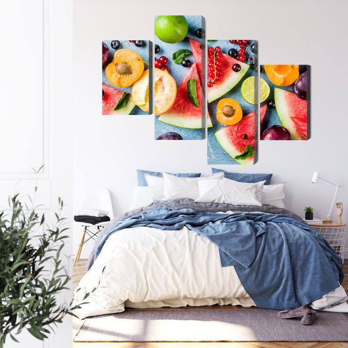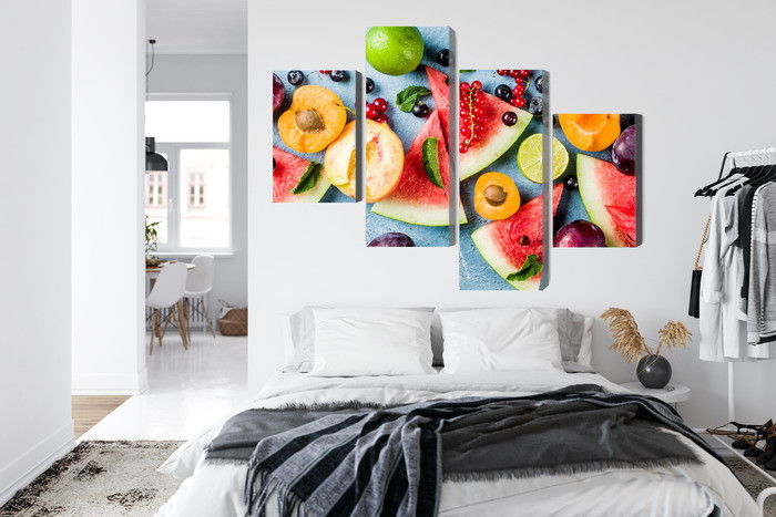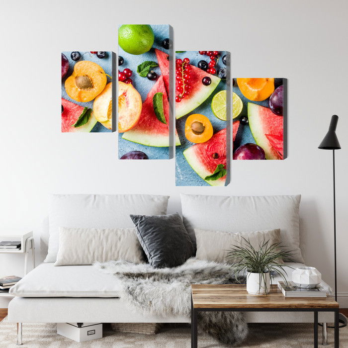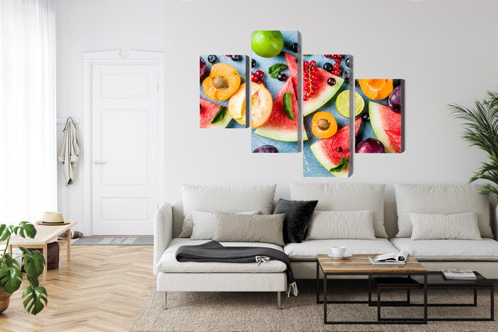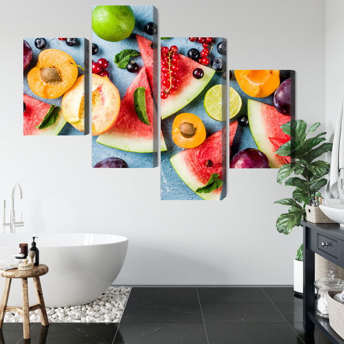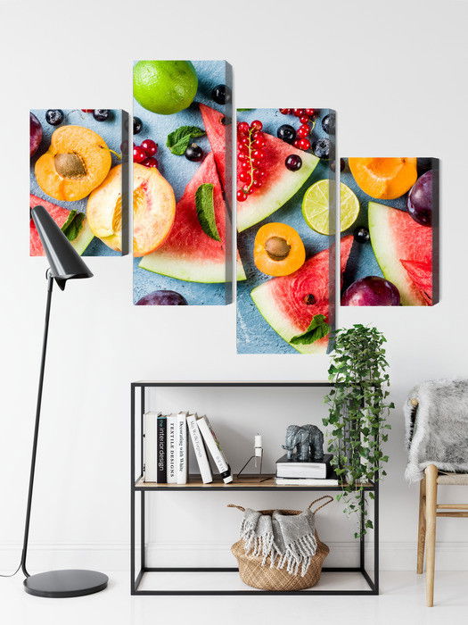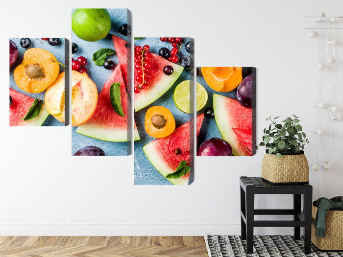 Motivet Holiday fruit återges med hög färgprecision och detaljrikedom tack vare HP Latex-teknologi. Trycket sker med vattenbaserade, luktfria och GREENGUARD Gold-certifierade bläck som ger en upplösning på upp till 300 DPI. Färgerna är UV-beständiga och behåller sin styrka även i ljusa rum, vilket gör tavlan lämplig för både hem- och offentliga miljöer.