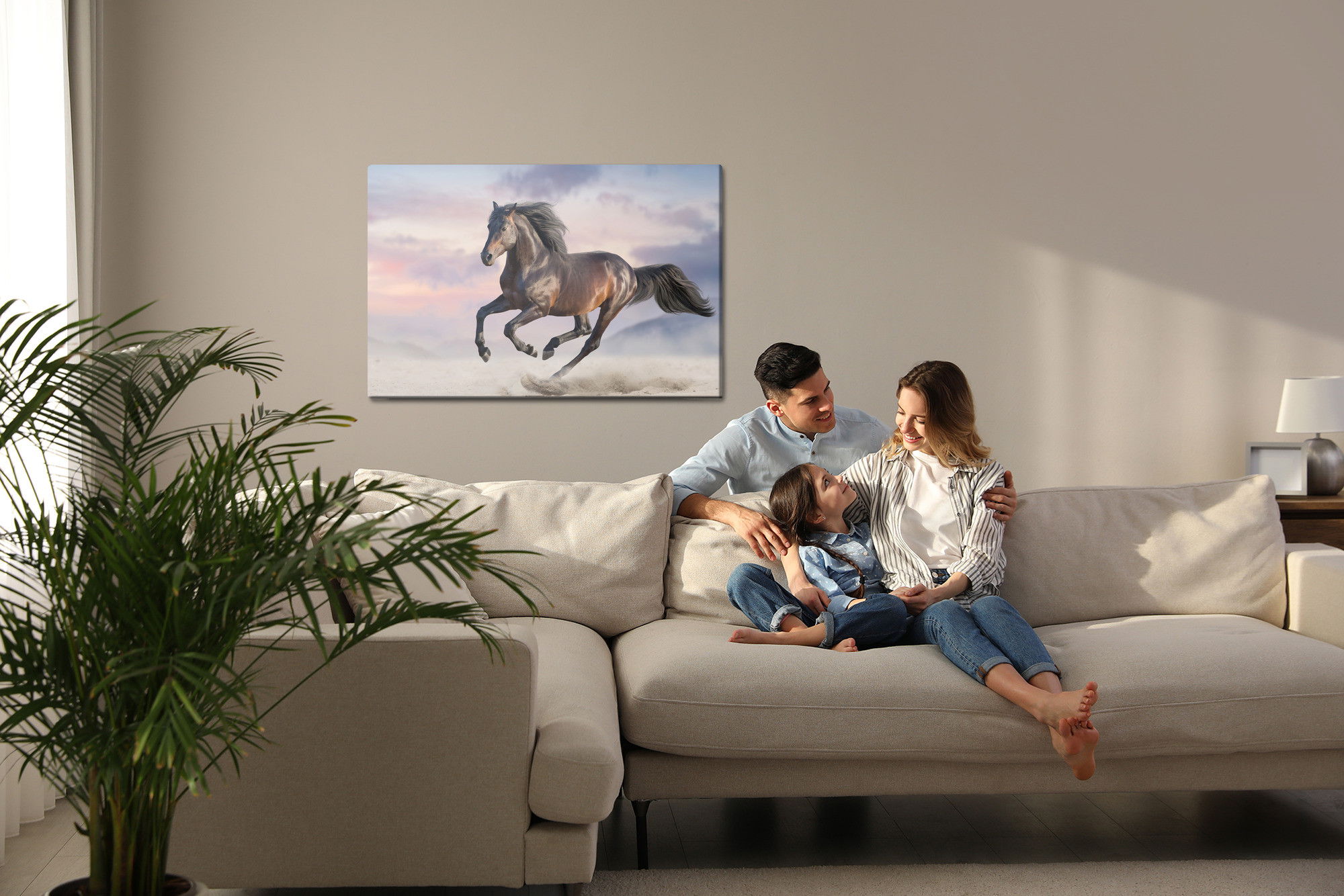 Motivet Horse at a gallop återges med hög färgprecision och detaljrikedom tack vare HP Latex-teknologi. Trycket sker med vattenbaserade, luktfria och GREENGUARD Gold-certifierade bläck som ger en upplösning på upp till 300 DPI. Färgerna är UV-beständiga och behåller sin styrka även i ljusa rum, vilket gör tavlan lämplig för både hem- och offentliga miljöer.