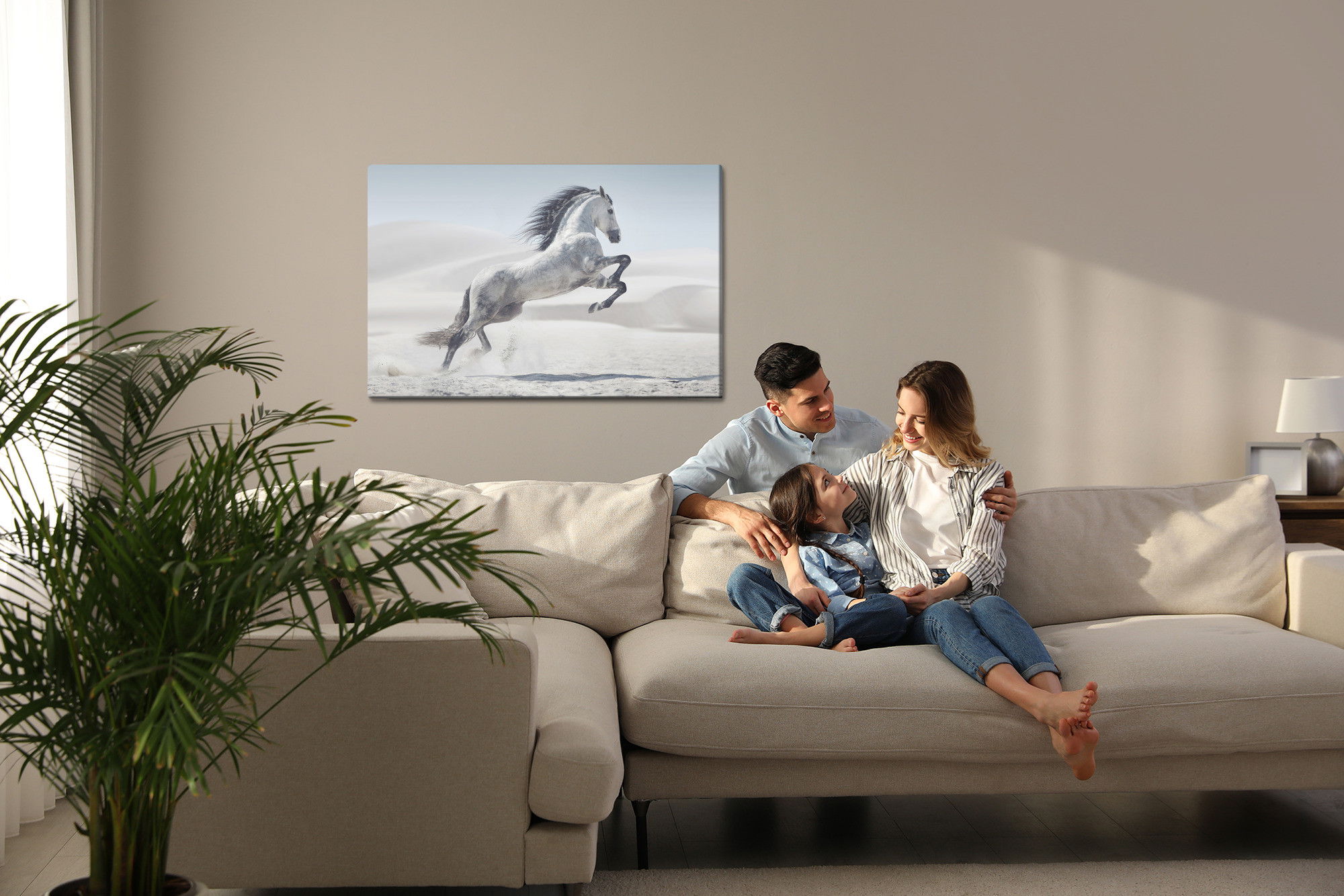Varje tavla monteras på en massiv fururam. Format upp till 70×50 cm har en ram på 15 mm, medan format från 90×60 cm och uppåt har en ram på 20 mm. Den exakta dukspänningen gör att tavlan håller sin form över tid. Motivet Horse in the desert trycks runt hela ramen vilket ger ett stilrent galleriuttryck där tavlan är lika vacker från sidan som framifrån. Kombinationen av rak dukspänning, rena linjer och korrekt tryck ger en professionell finish.