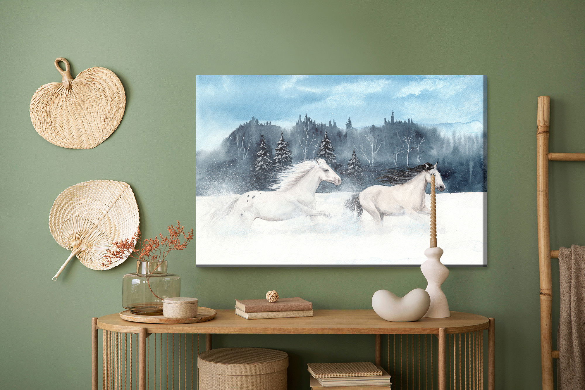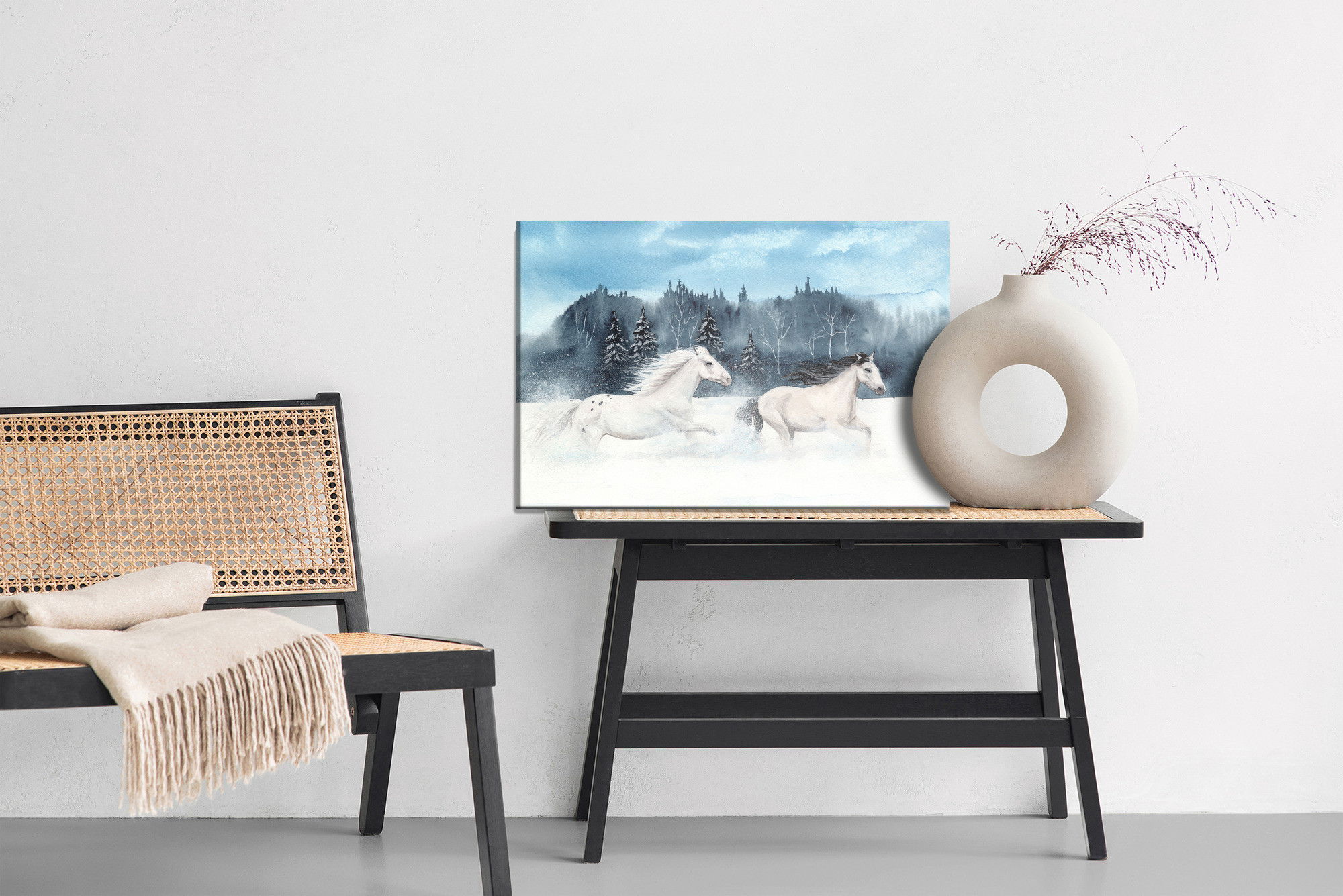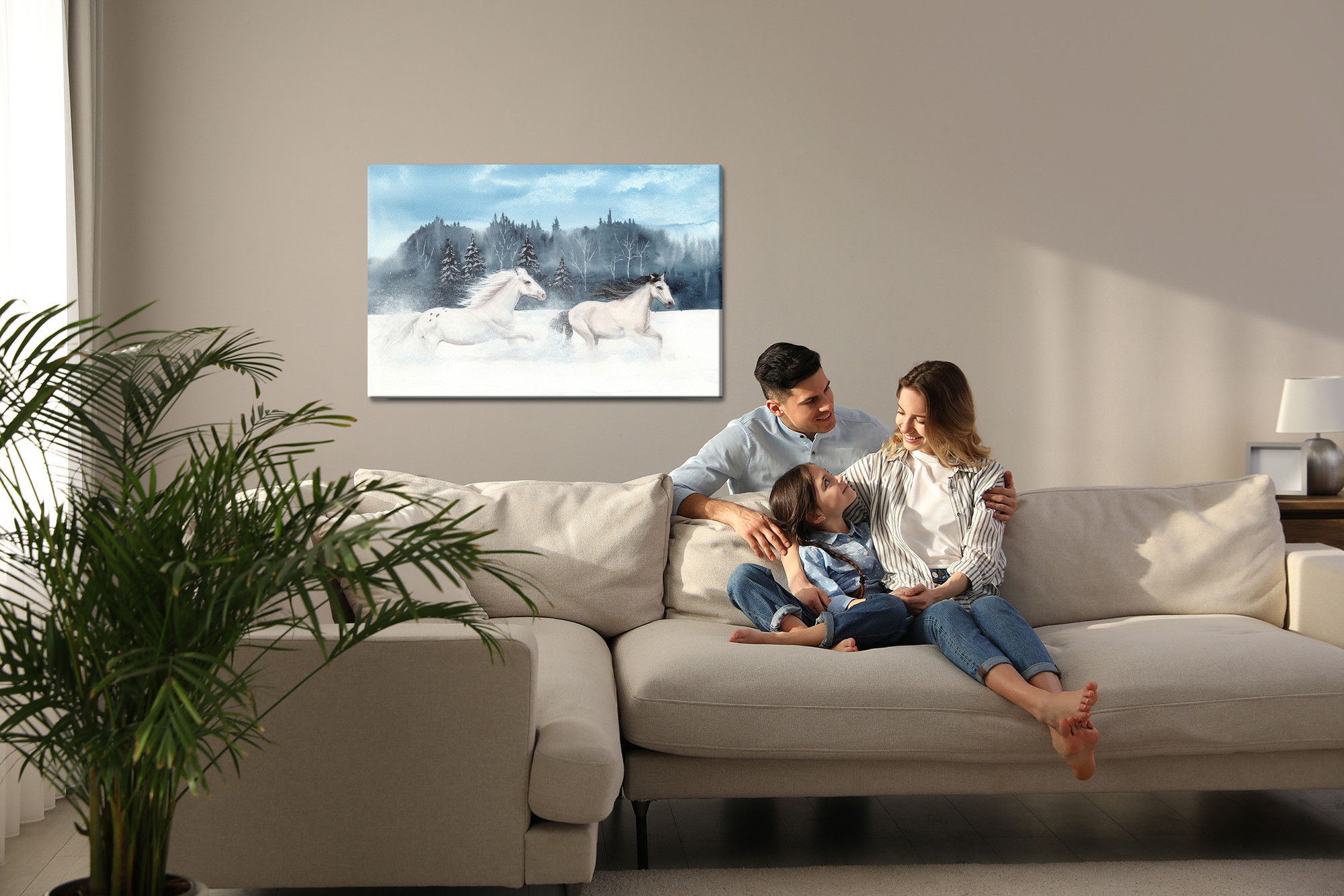 Varje tavla monteras på en massiv fururam. Format upp till 70×50 cm har en ram på 15 mm, medan format från 90×60 cm och uppåt har en ram på 20 mm. Den exakta dukspänningen gör att tavlan håller sin form över tid. Motivet Horses galloping trycks runt hela ramen vilket ger ett stilrent galleriuttryck där tavlan är lika vacker från sidan som framifrån. Kombinationen av rak dukspänning, rena linjer och korrekt tryck ger en professionell finish.